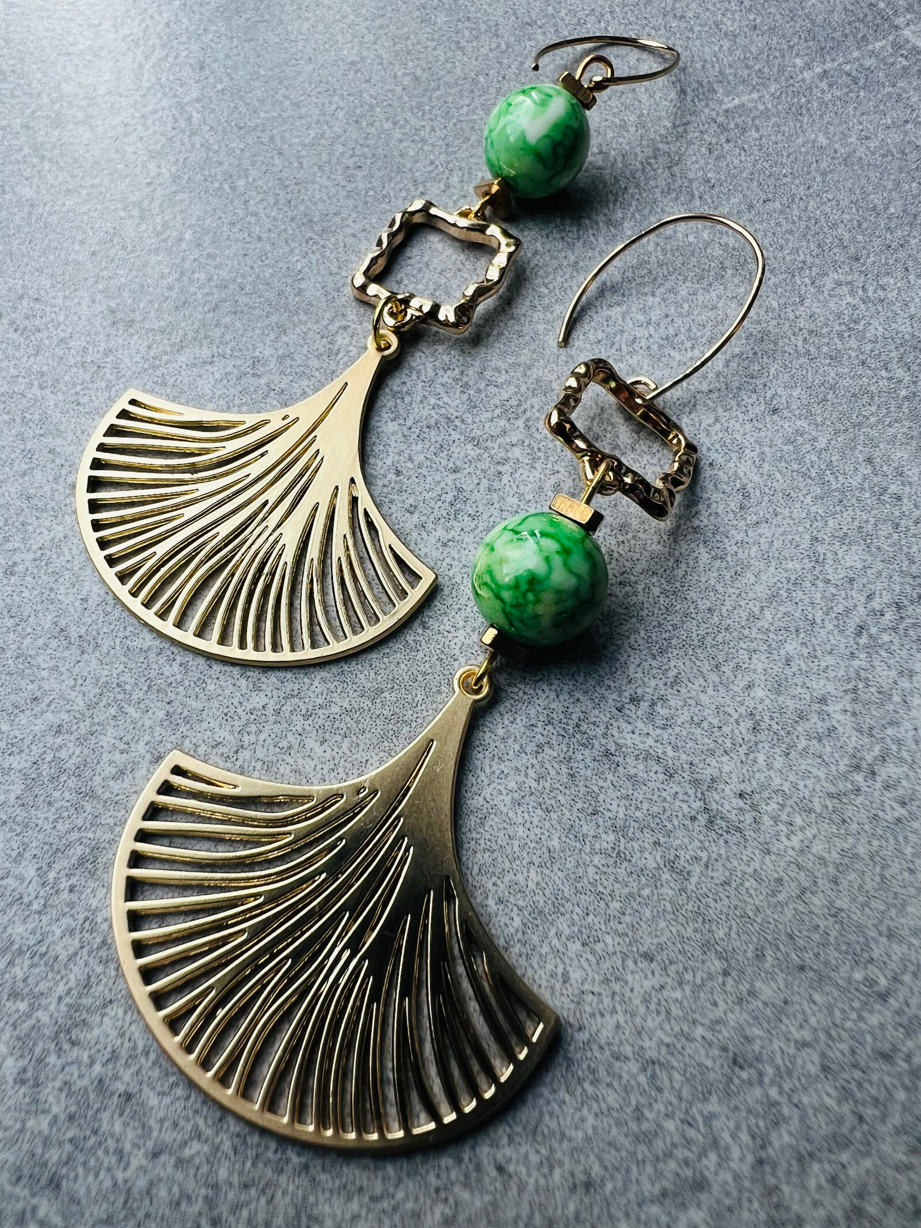 Boucles d’oreilles feuilles dorées et perles vert pomme - Créations Uniques