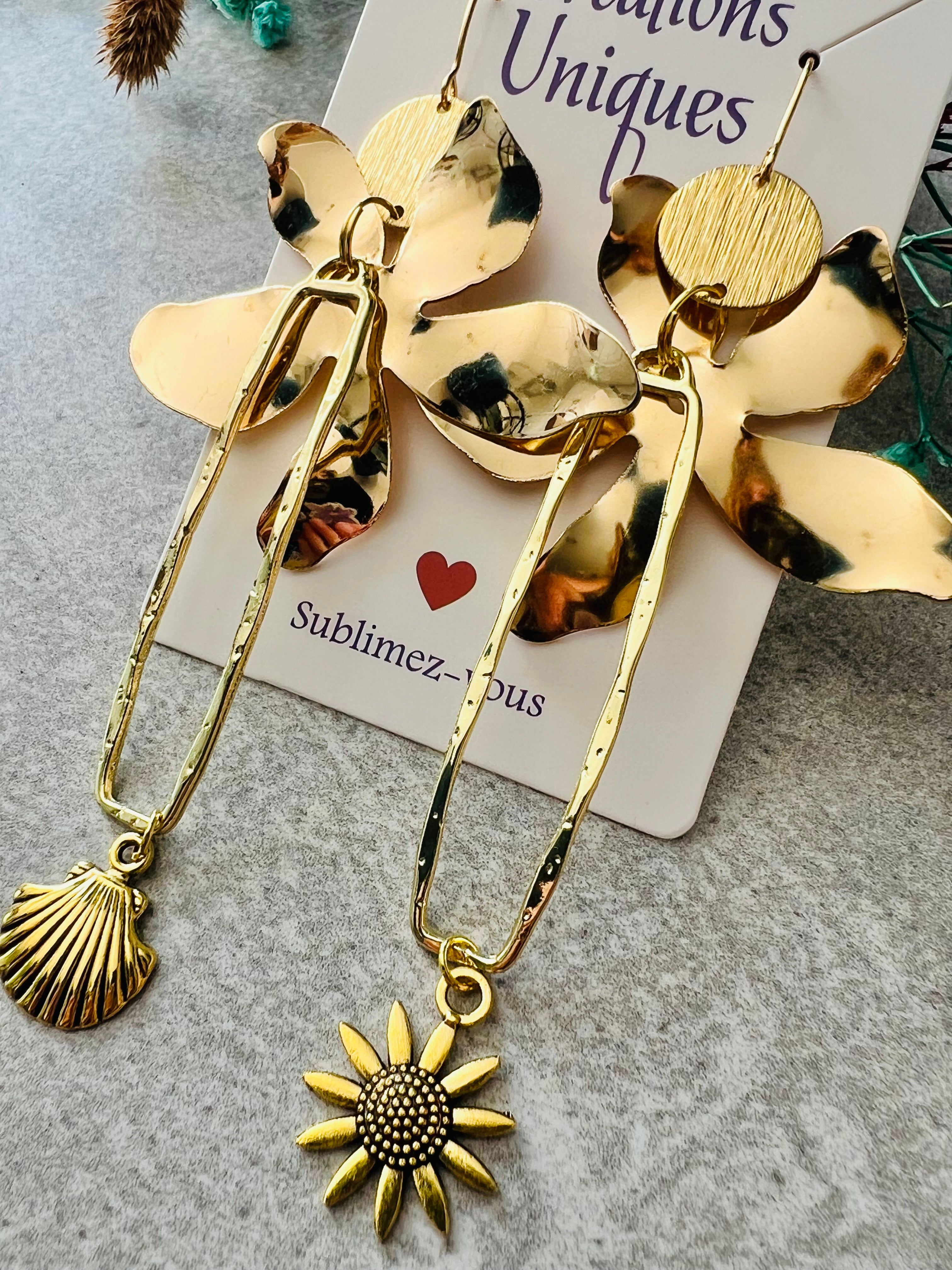 - Édition limitée à un seul exemplaire ! - Pendentifs asymétriques coquillages et soleil