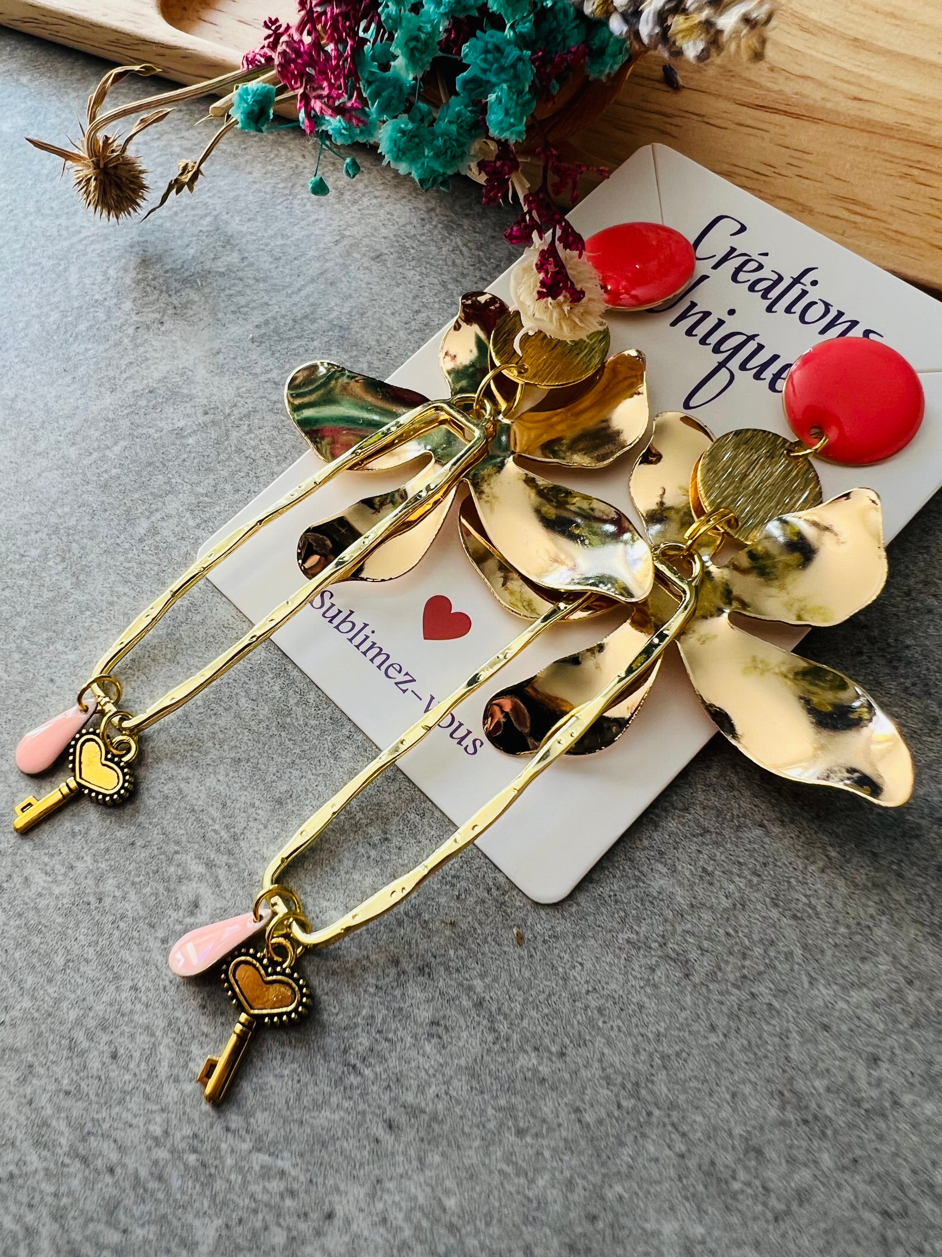 Boucles d’oreilles BETTY longues touche de corail - Créations Uniques