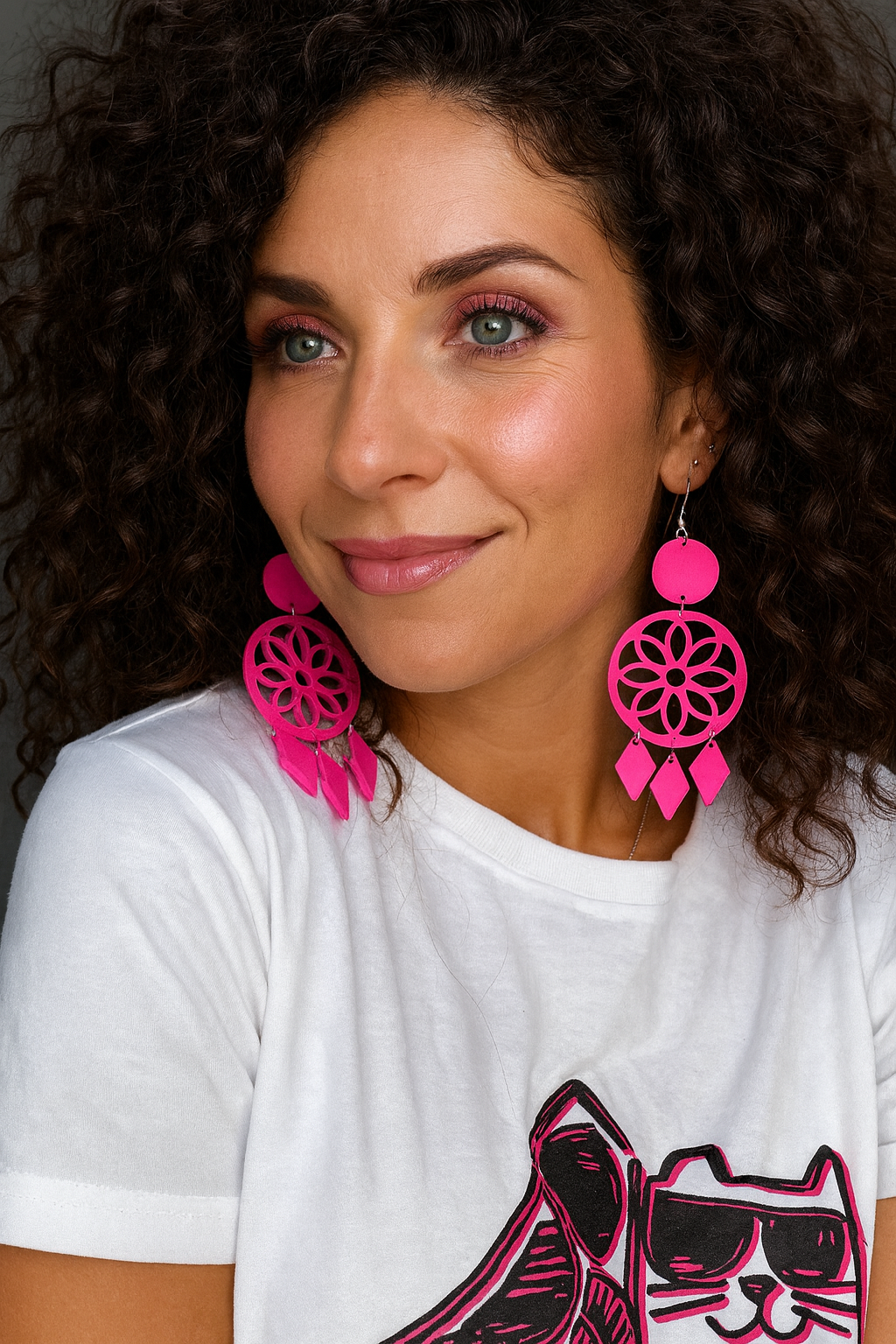 - Boucles d’oreilles, attrape-rêves, rose fluo