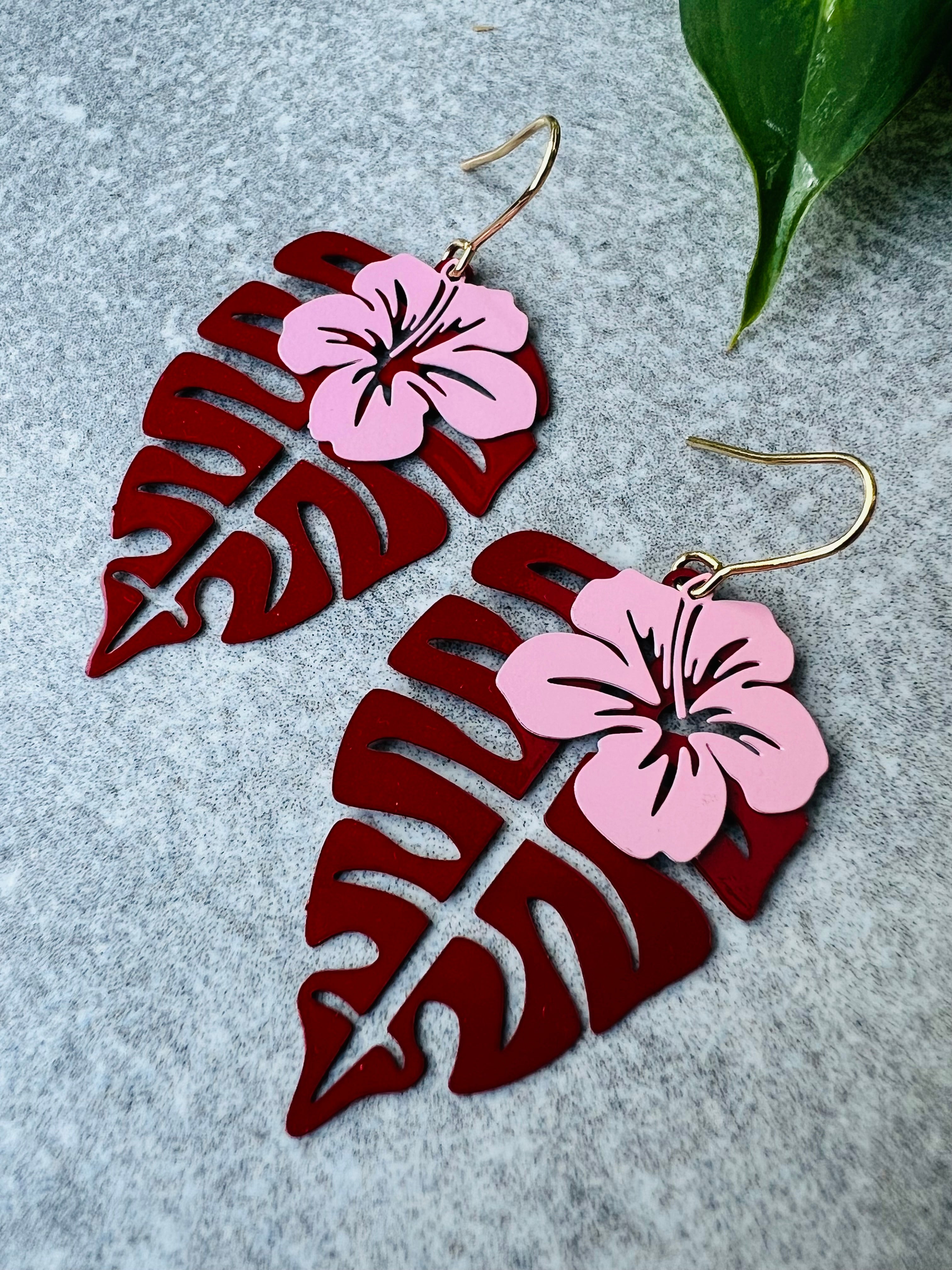 Boucles d’oreilles MARGARET feuilles tropicales et hibiscus - Créations Uniques