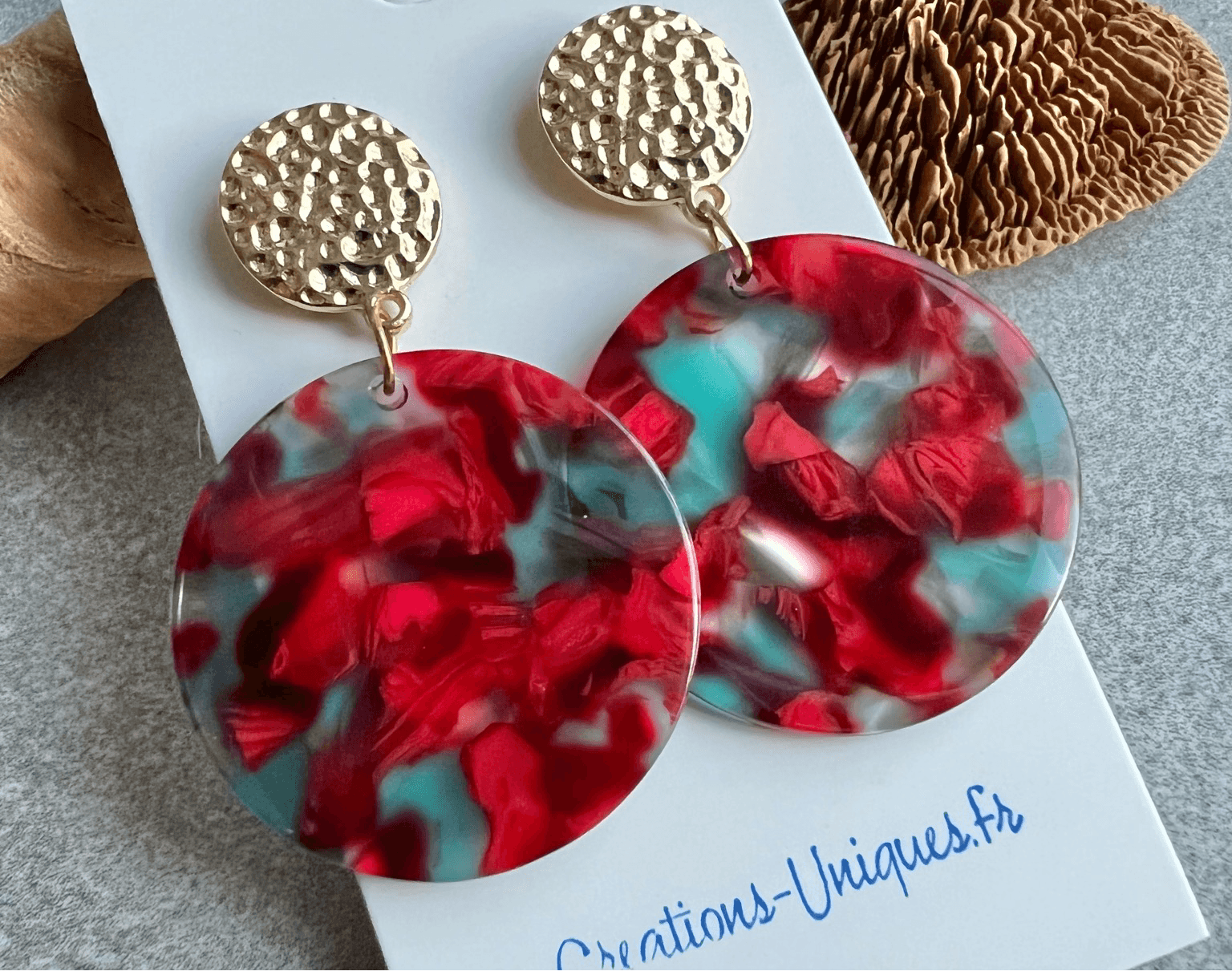 Boucles d’oreilles PAULA résine rouge, bleue et clous dorés - Créations Uniques