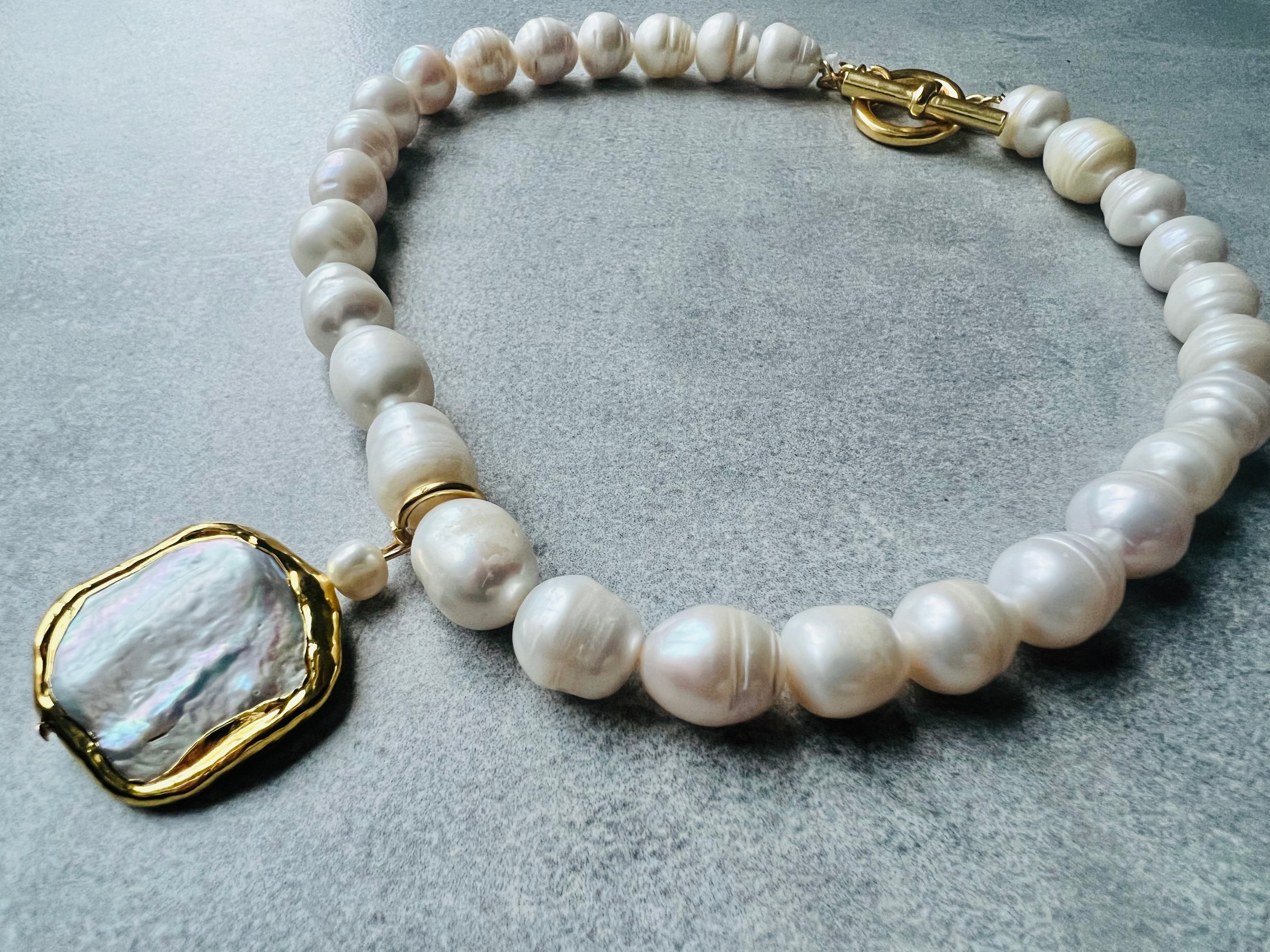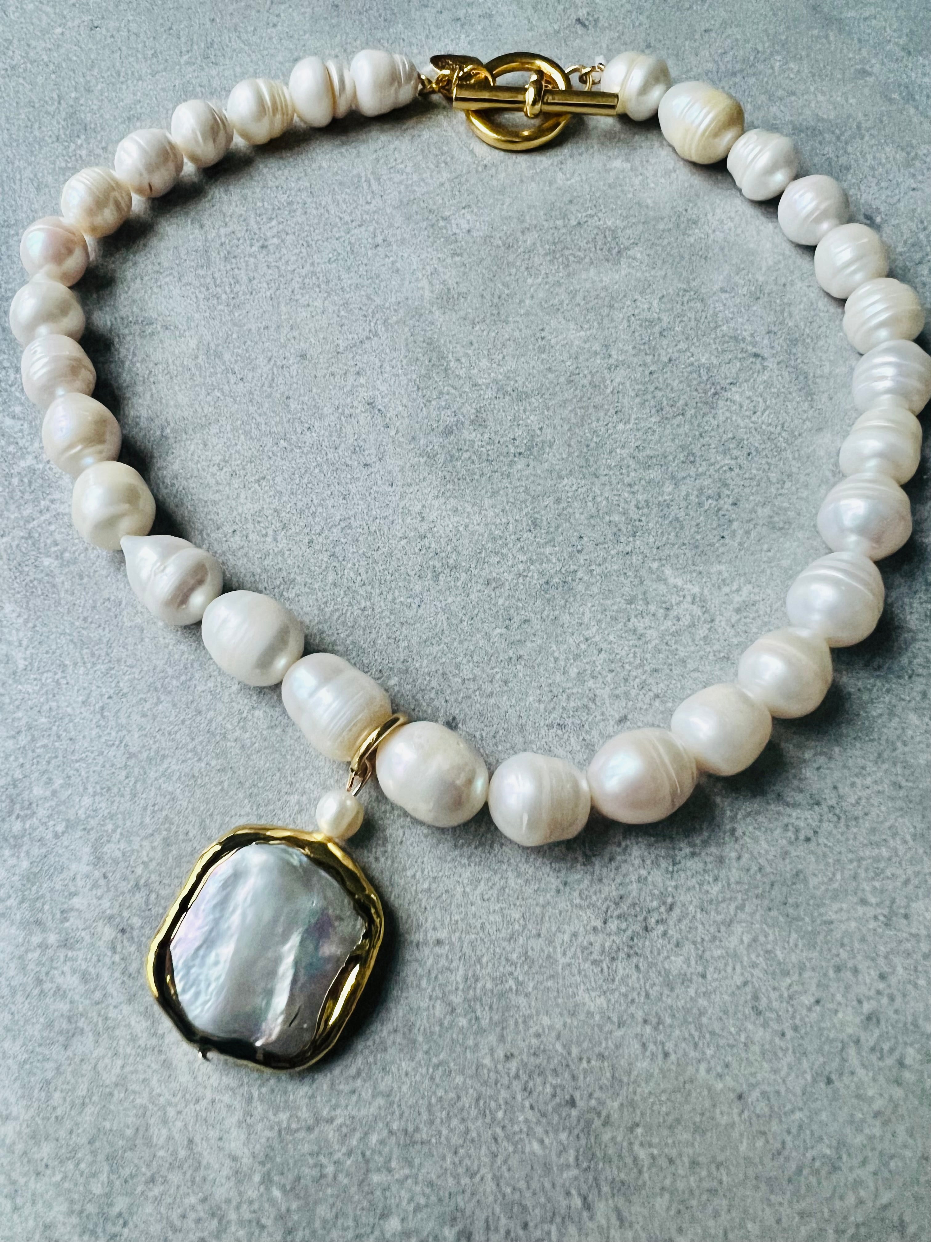 Collier de perles d'eau douce blanc crème avec grand pendentif en perles carrées et plates.
