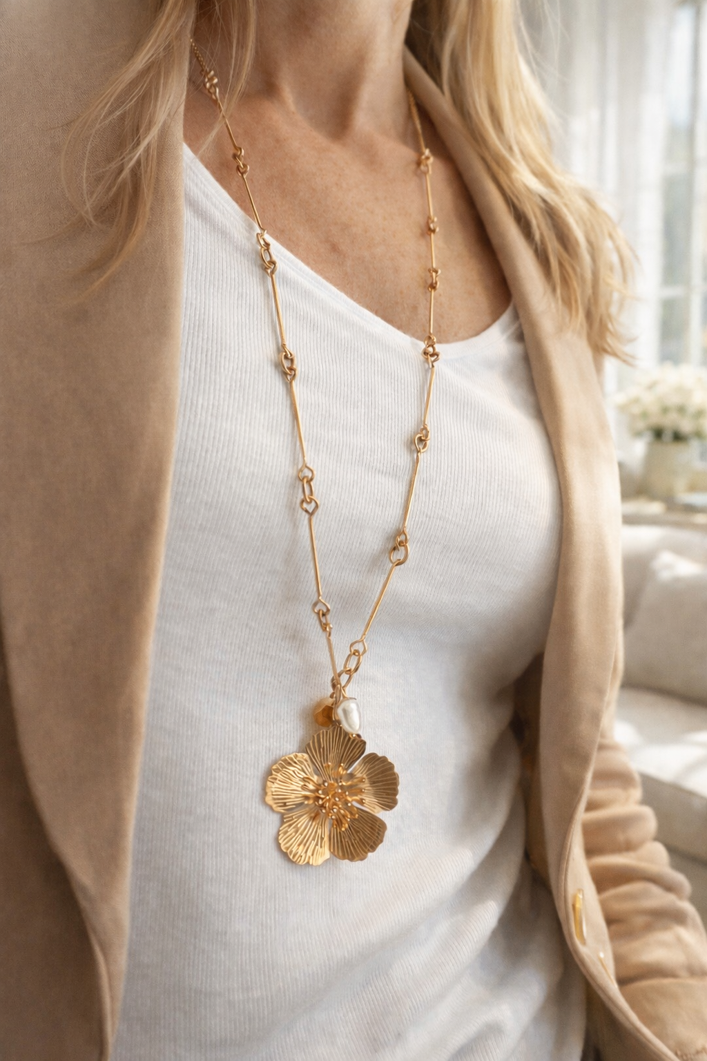 Collier MARILOU sautoir pendentif fleur dorée, perles blanc nacré