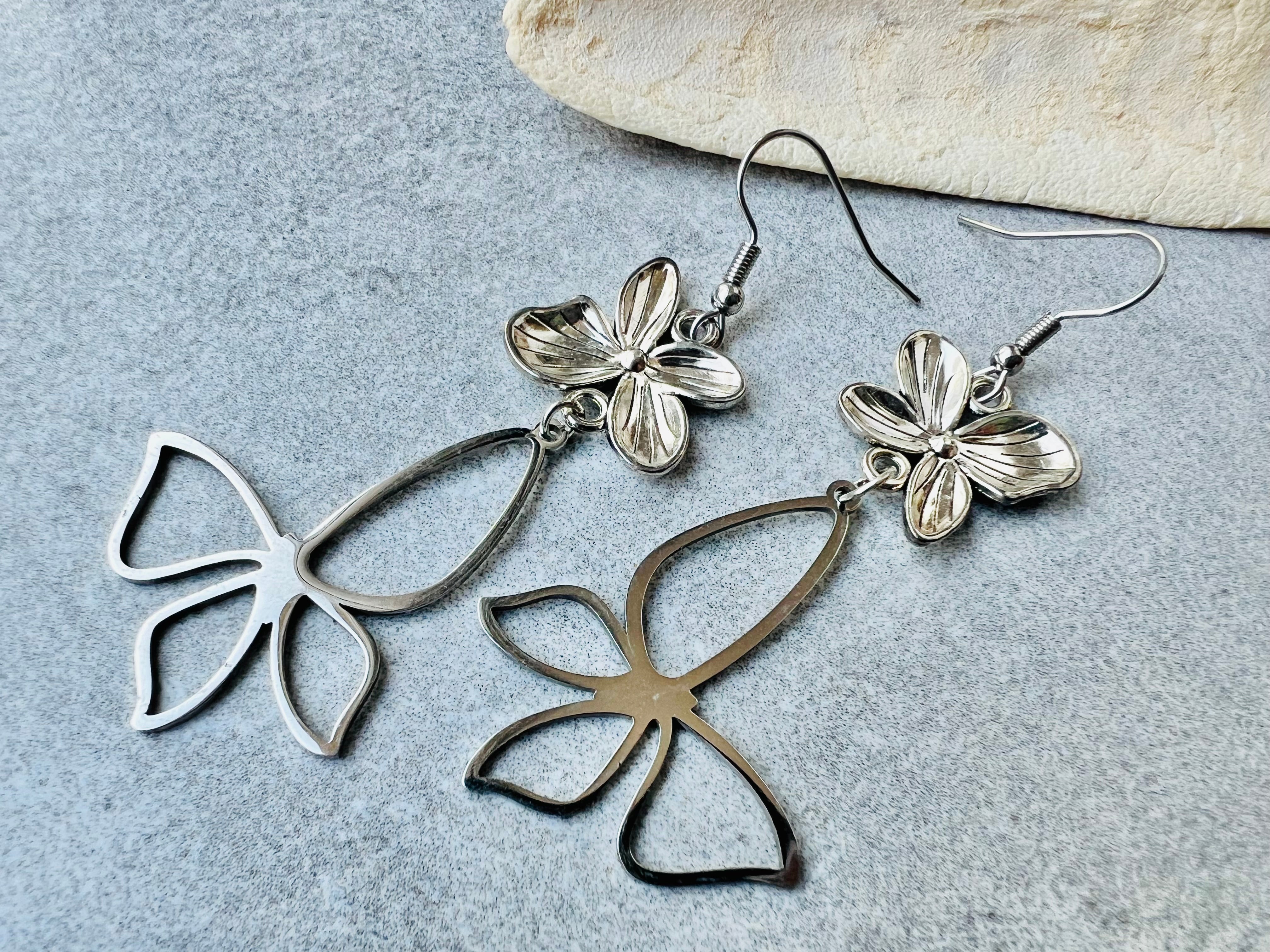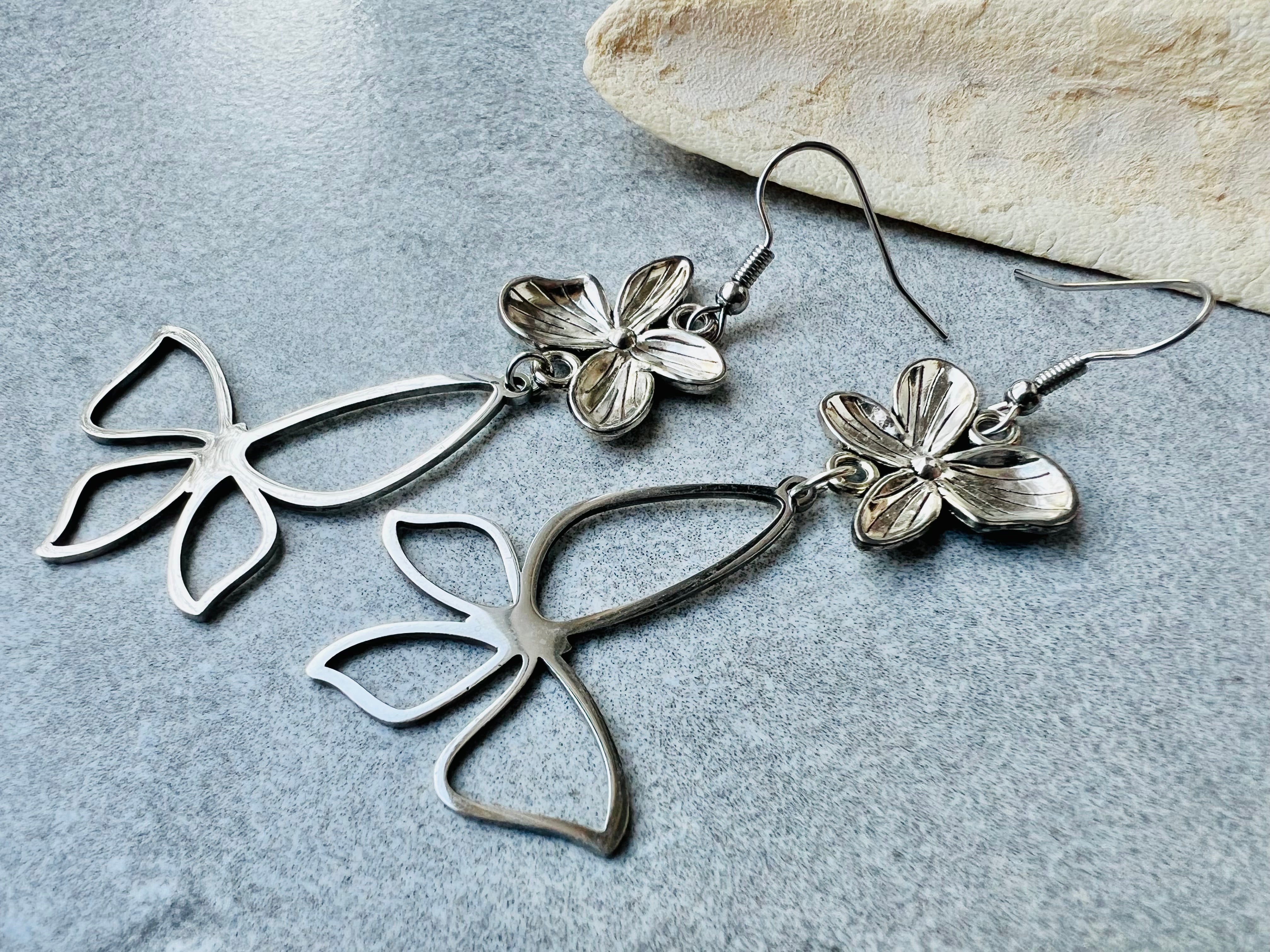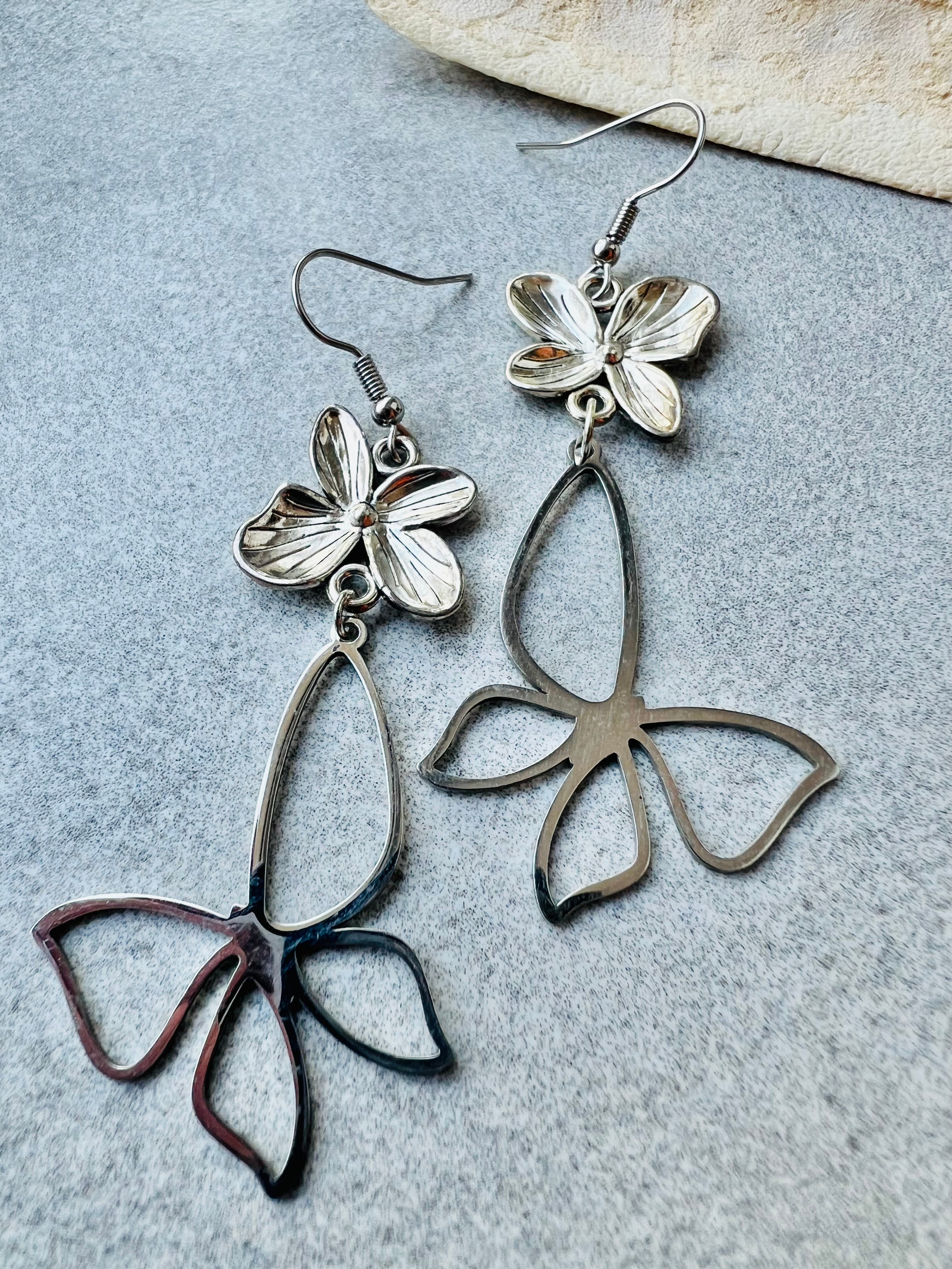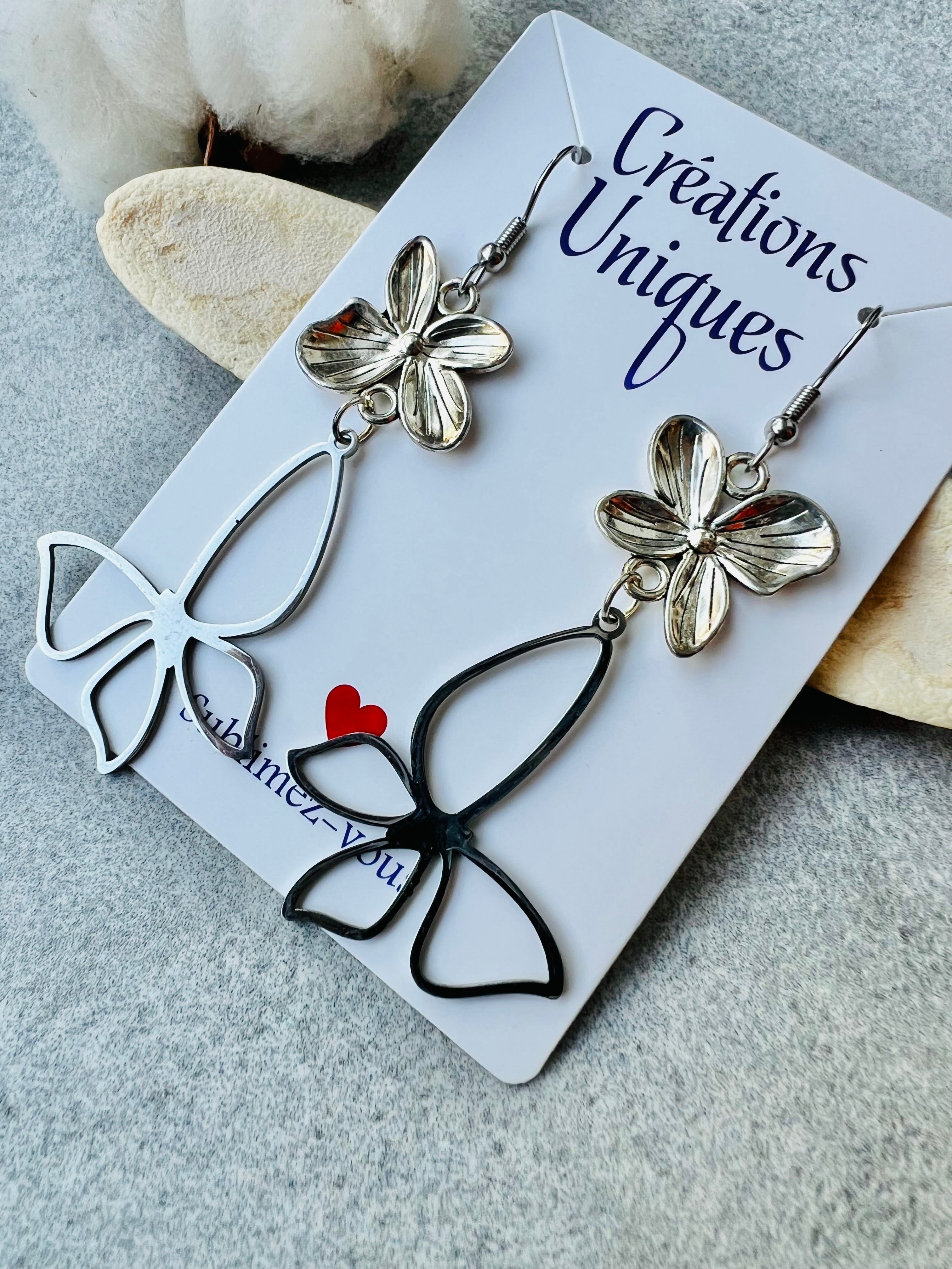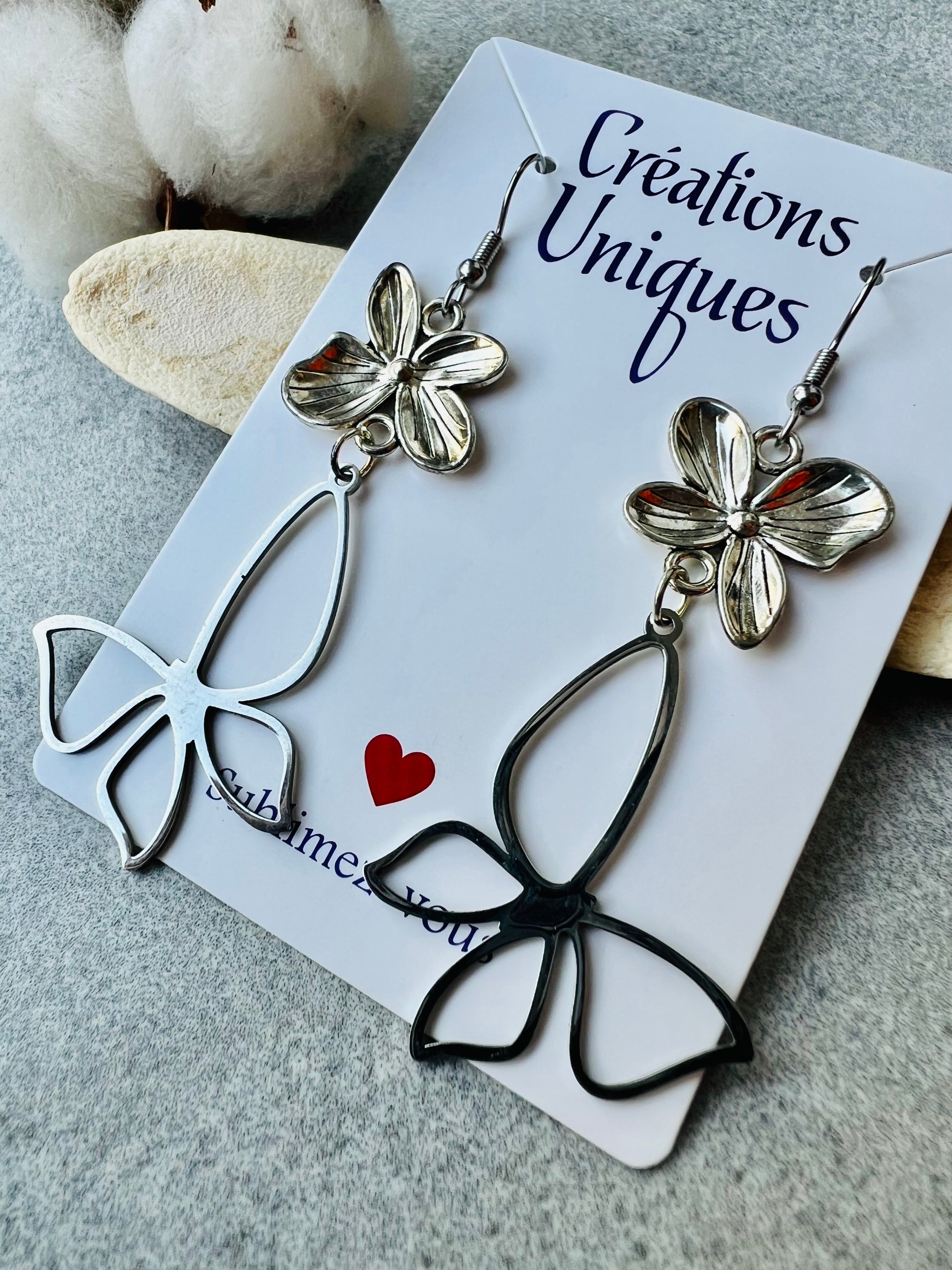 Boucles d’oreilles SUZETTE papillons et fleurs argentées, modèle asymétrique - Créations Uniques