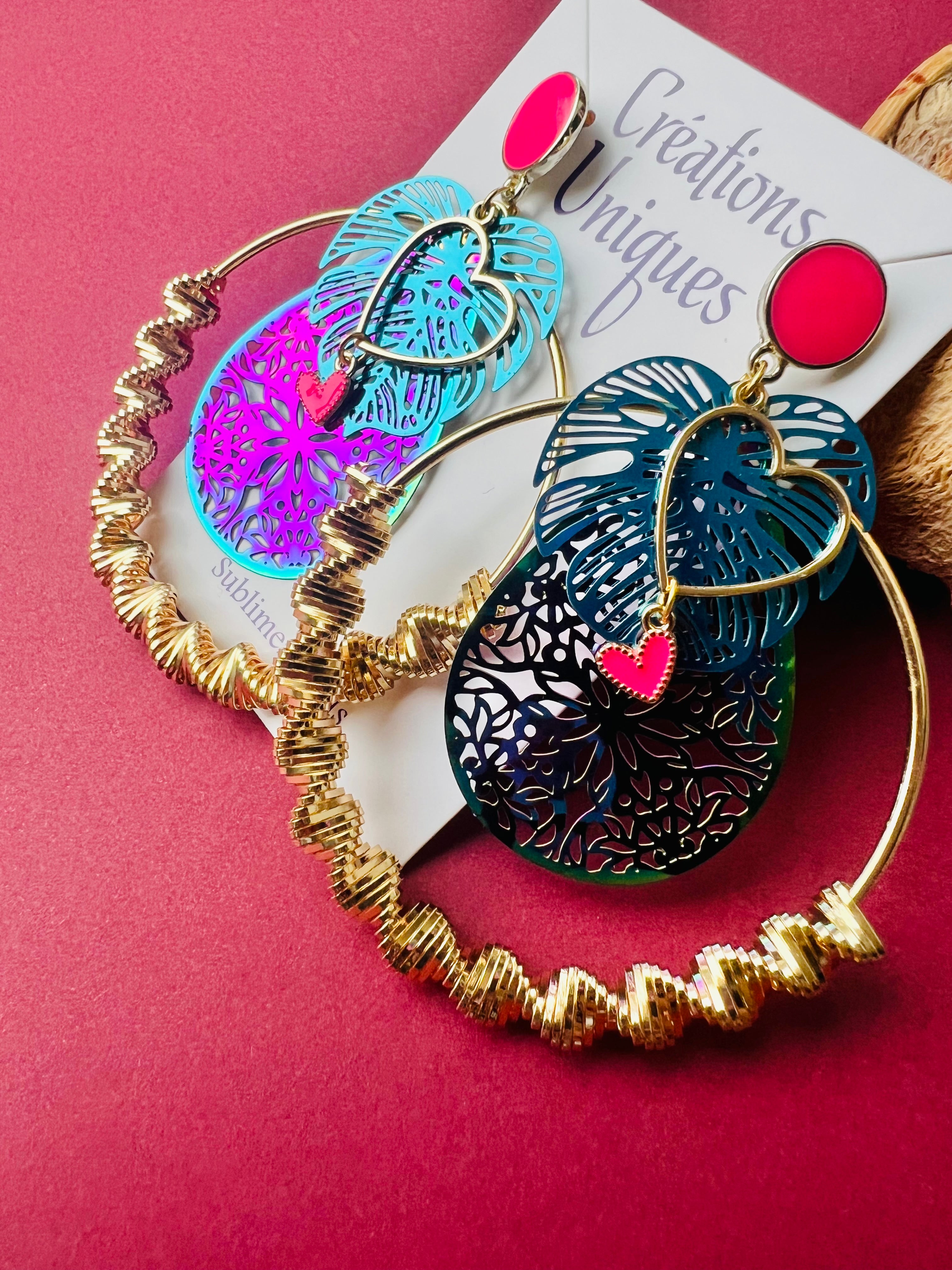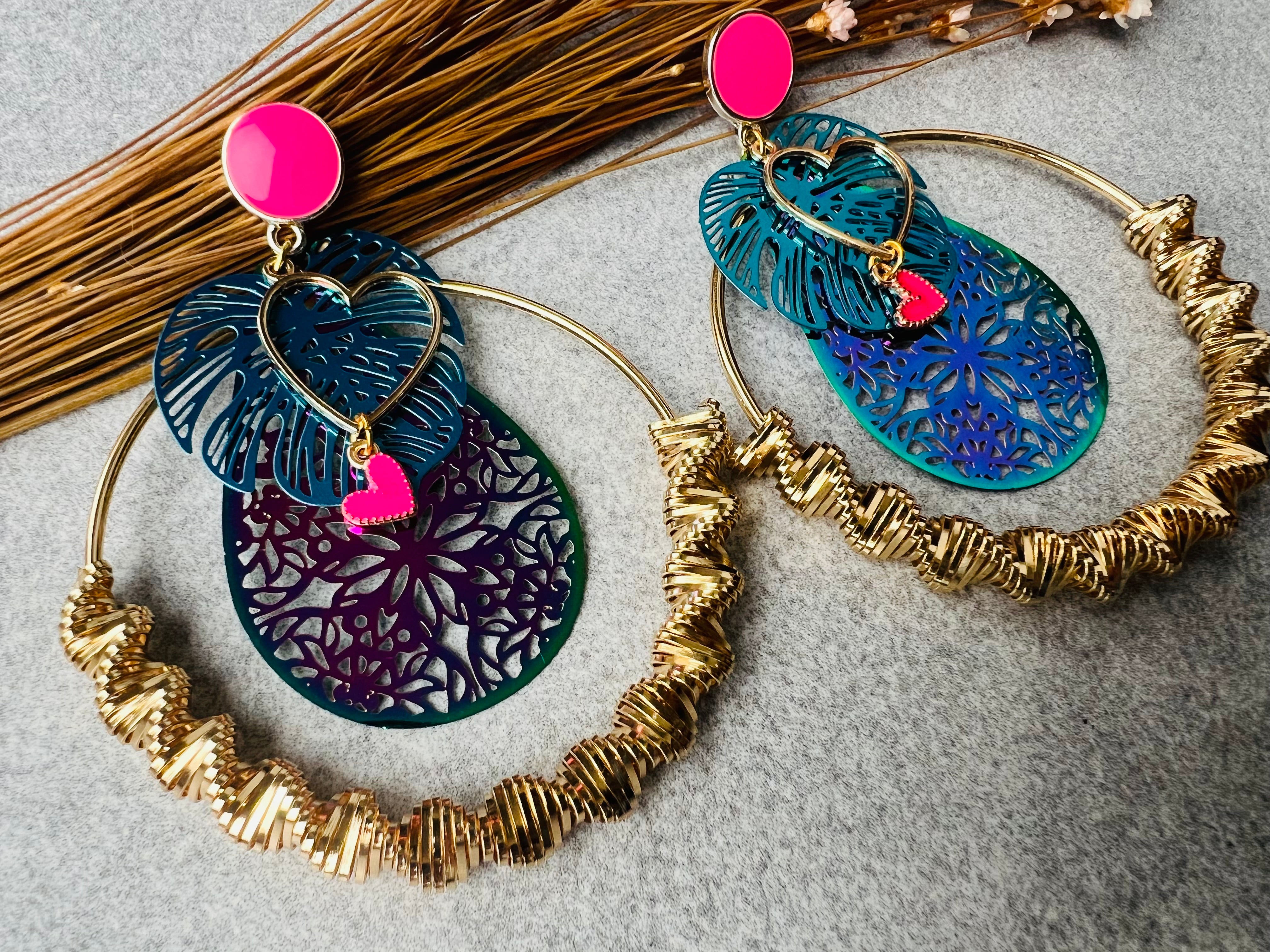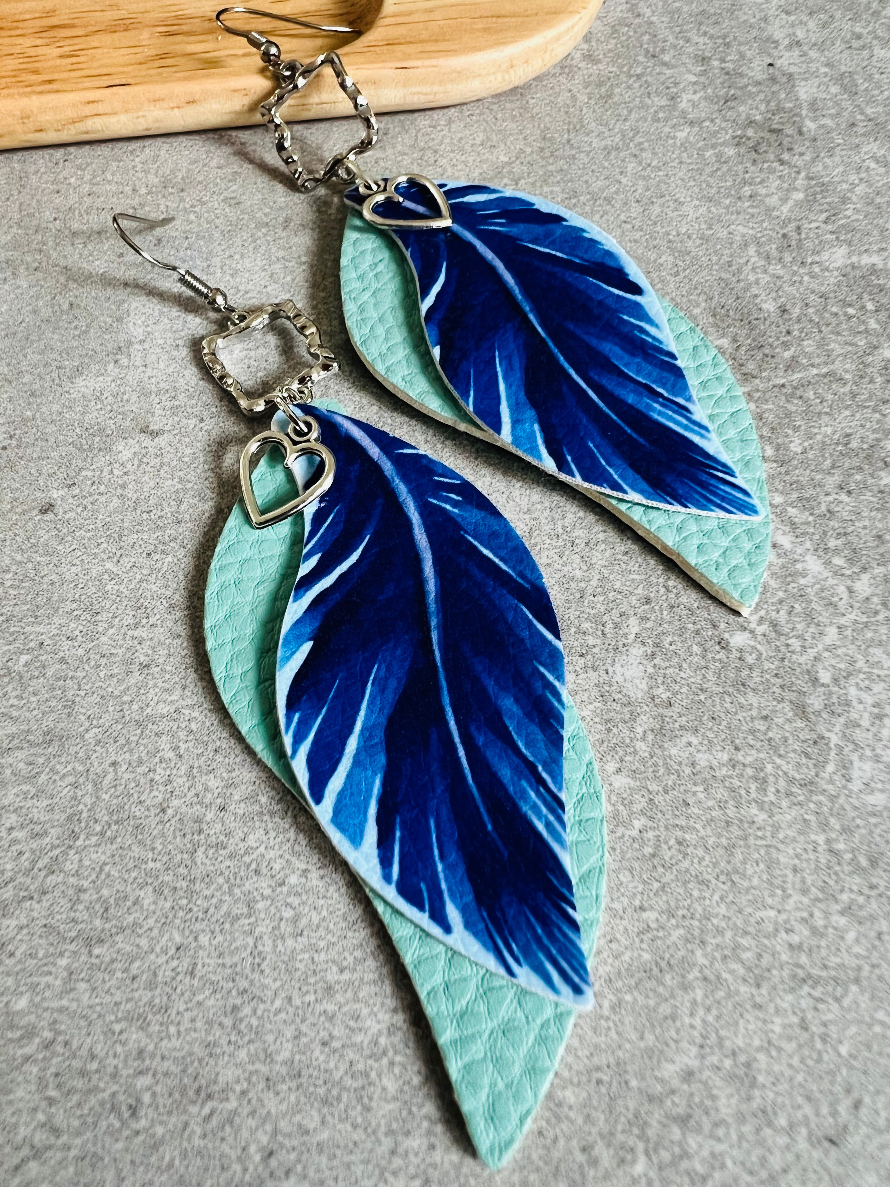 Boucles d’oreilles asymétriques love PAMELA feuilles tropicales bleues - Créations Uniques