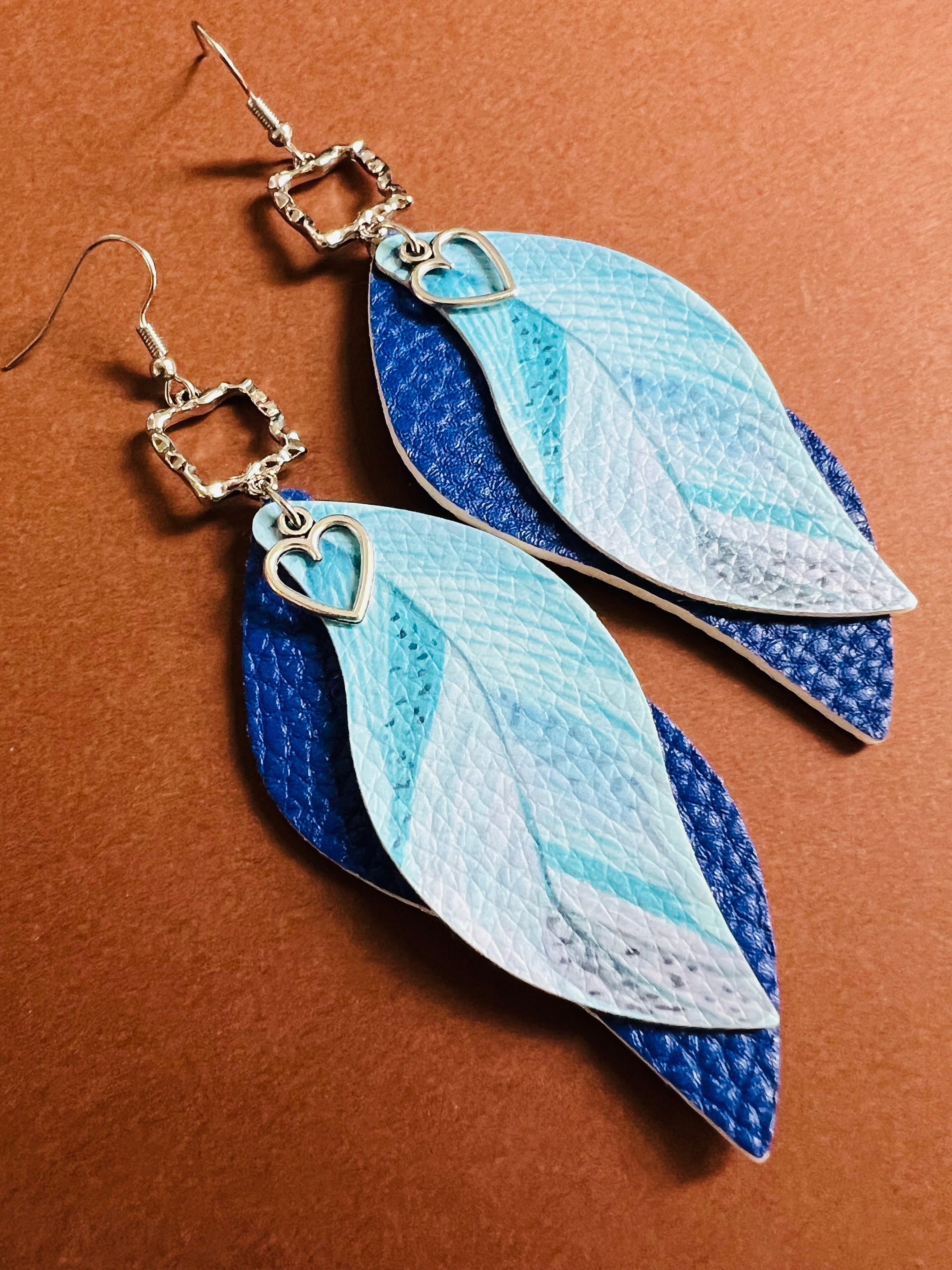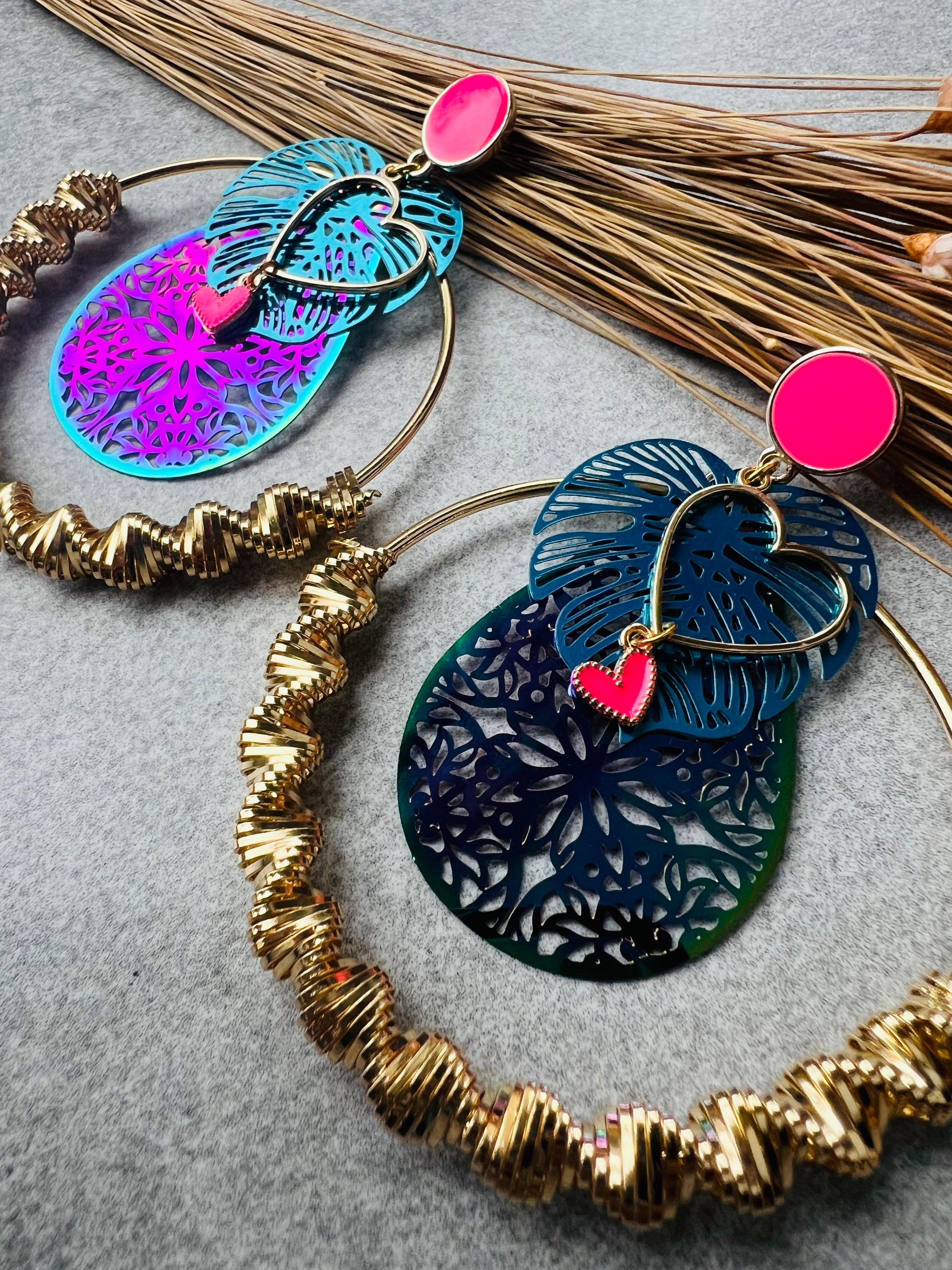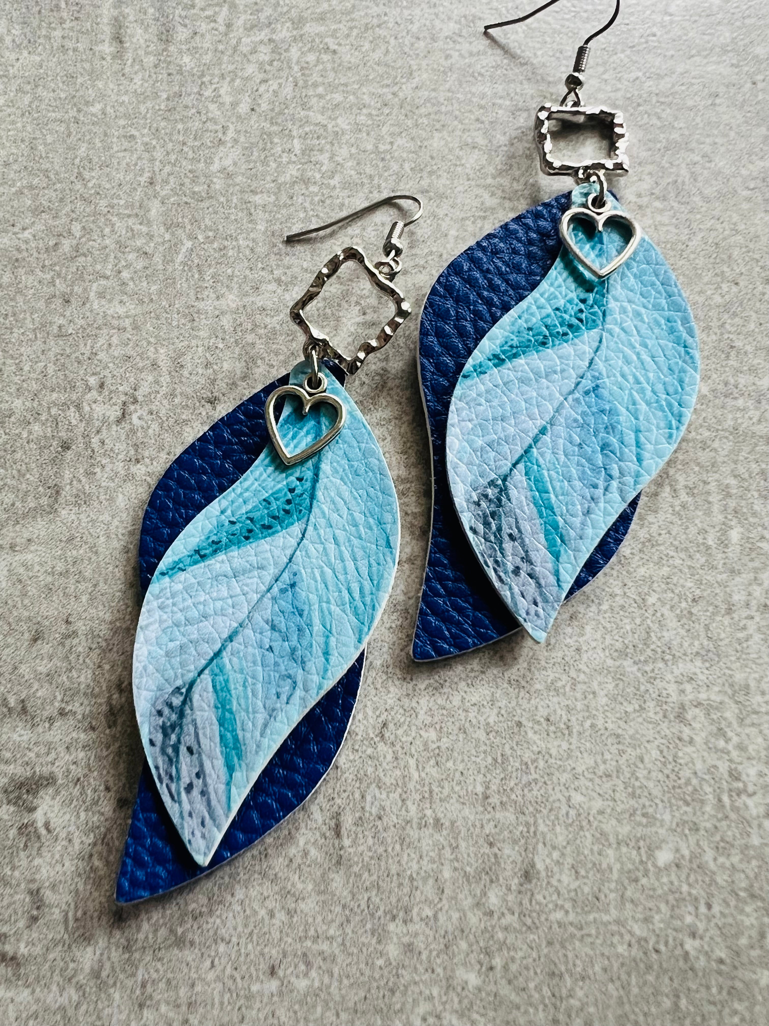Boucles d’oreilles asymétriques love PAMELA feuilles tropicales bleues - Créations Uniques