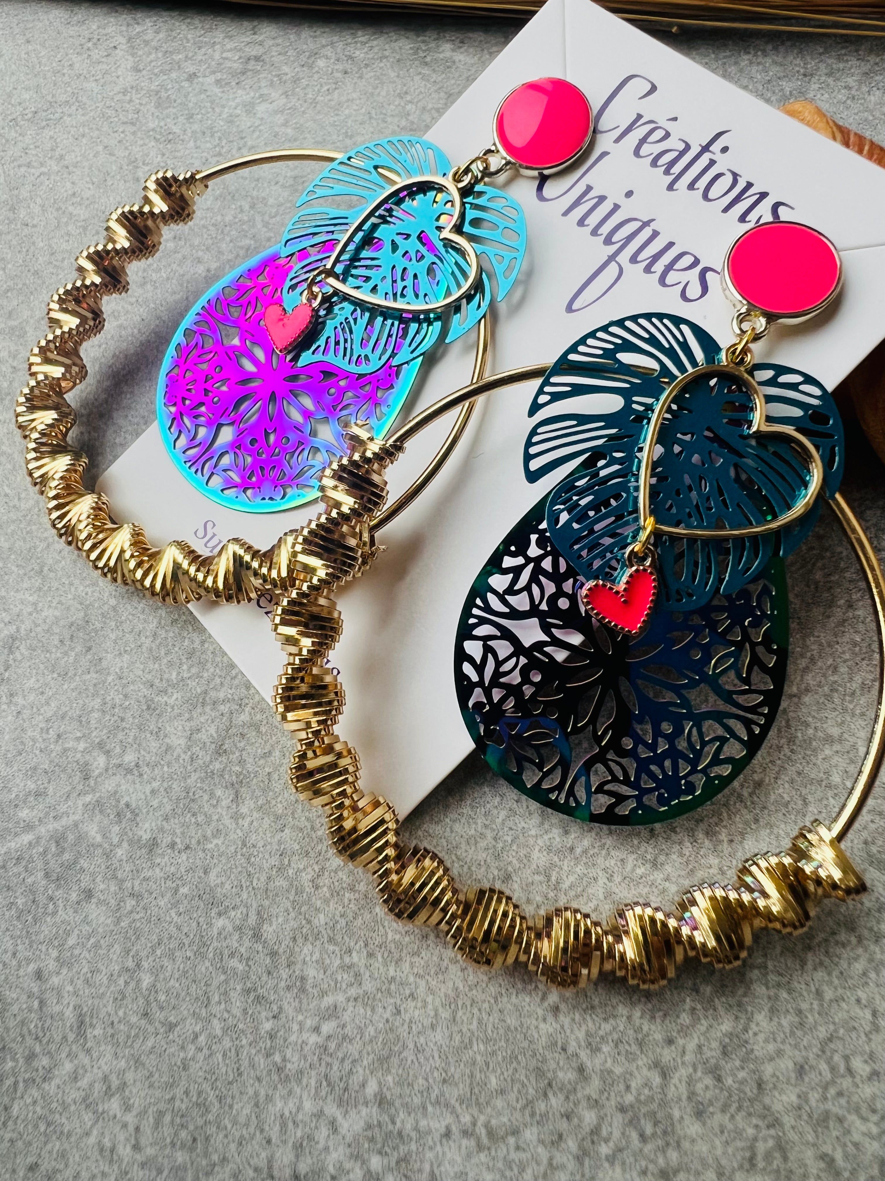 Boucles d’oreilles ADELINE style bohème, feuilles tropicales aubergine - Créations Uniques