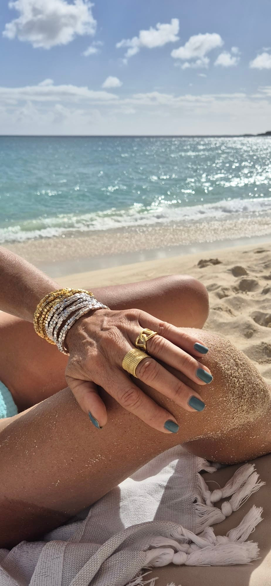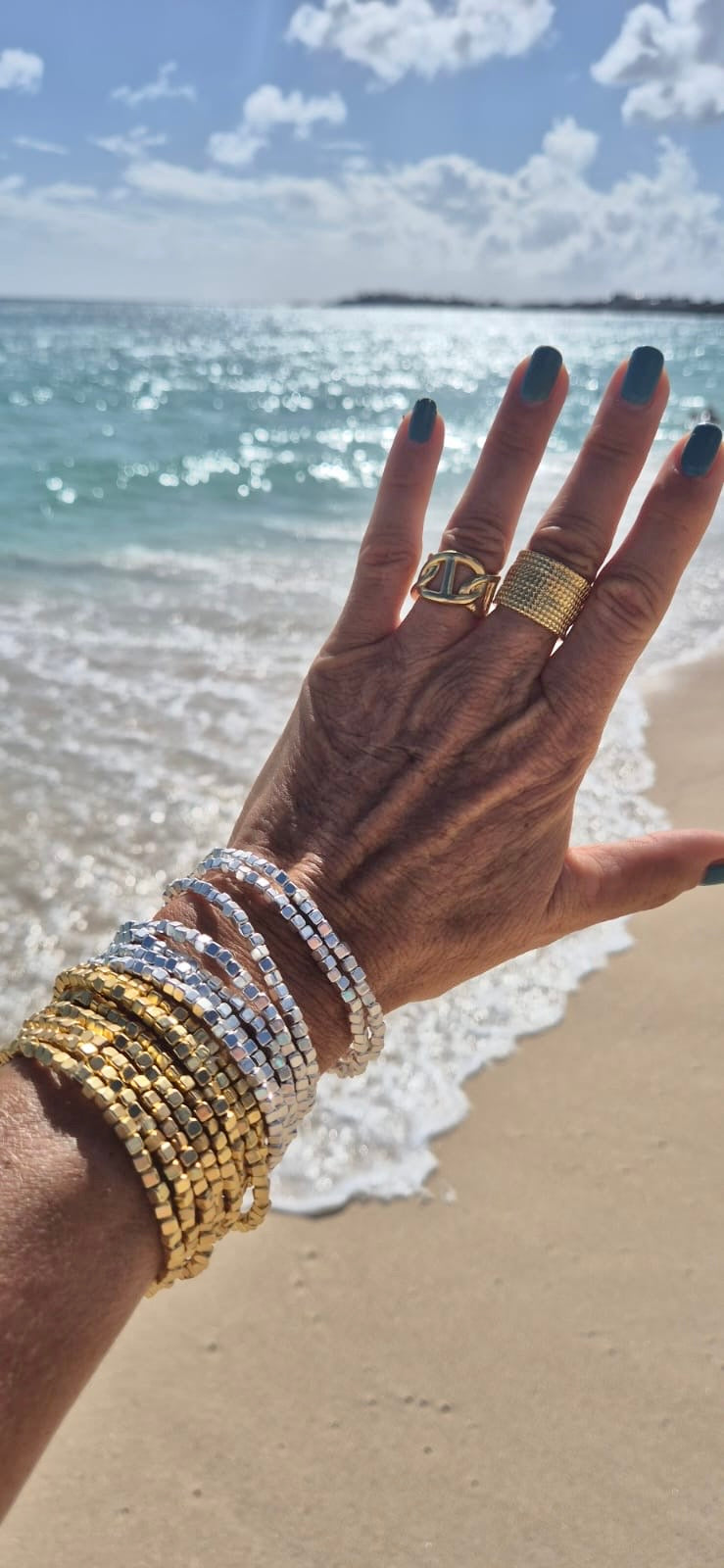 Notre ensemble amusant de 15 bracelets de perles empilables est désormais disponible en métaux mixtes ! Avec la moitié des brins en or et l'autre moitié en argent, procurez-vous-les et mélangez-les avec toutes vos tenues !