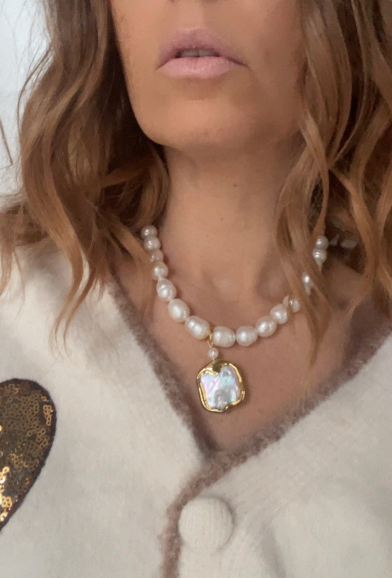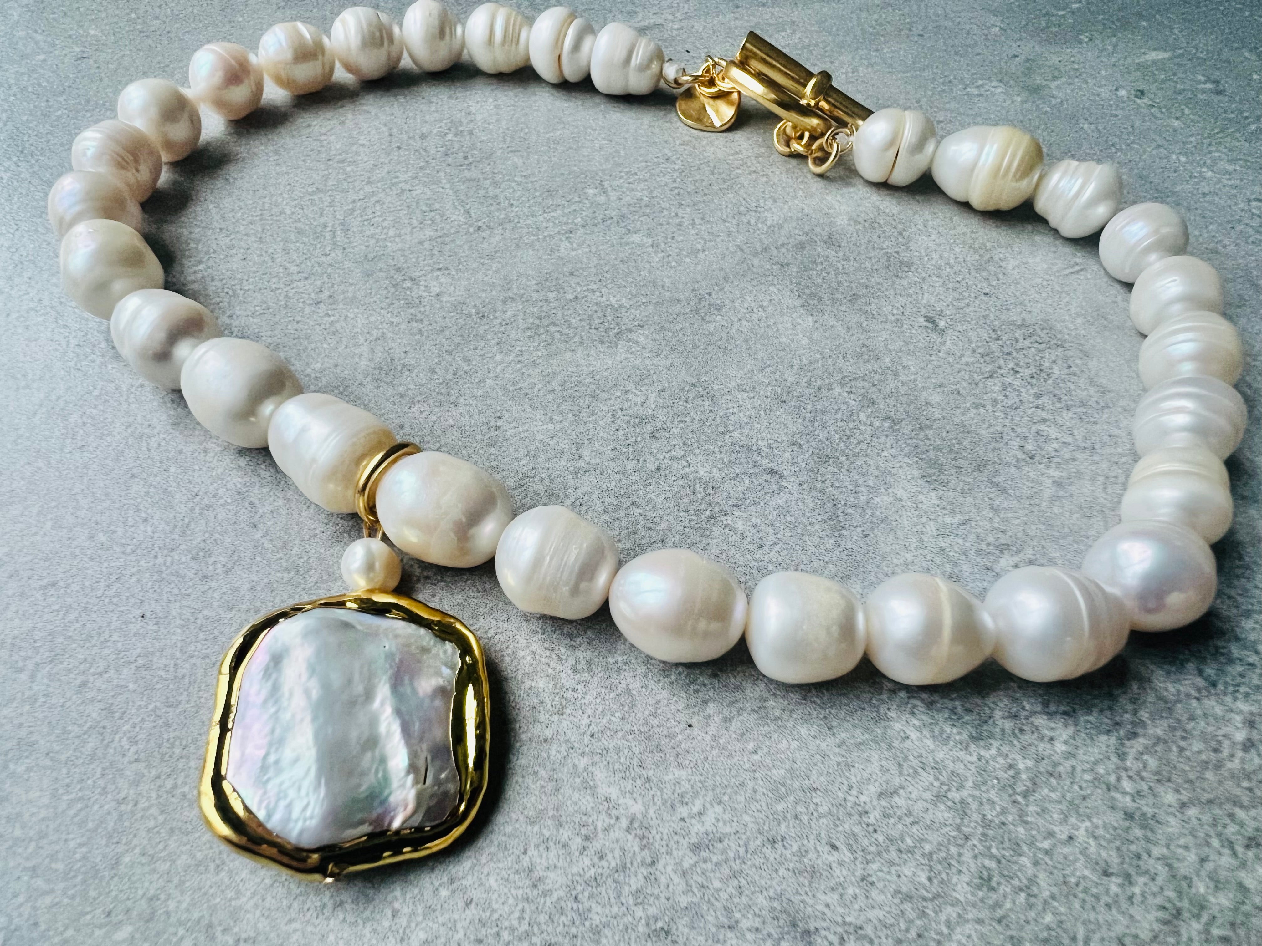 Collier de perles d'eau douce blanc crème avec grand pendentif en perles carrées et plates.