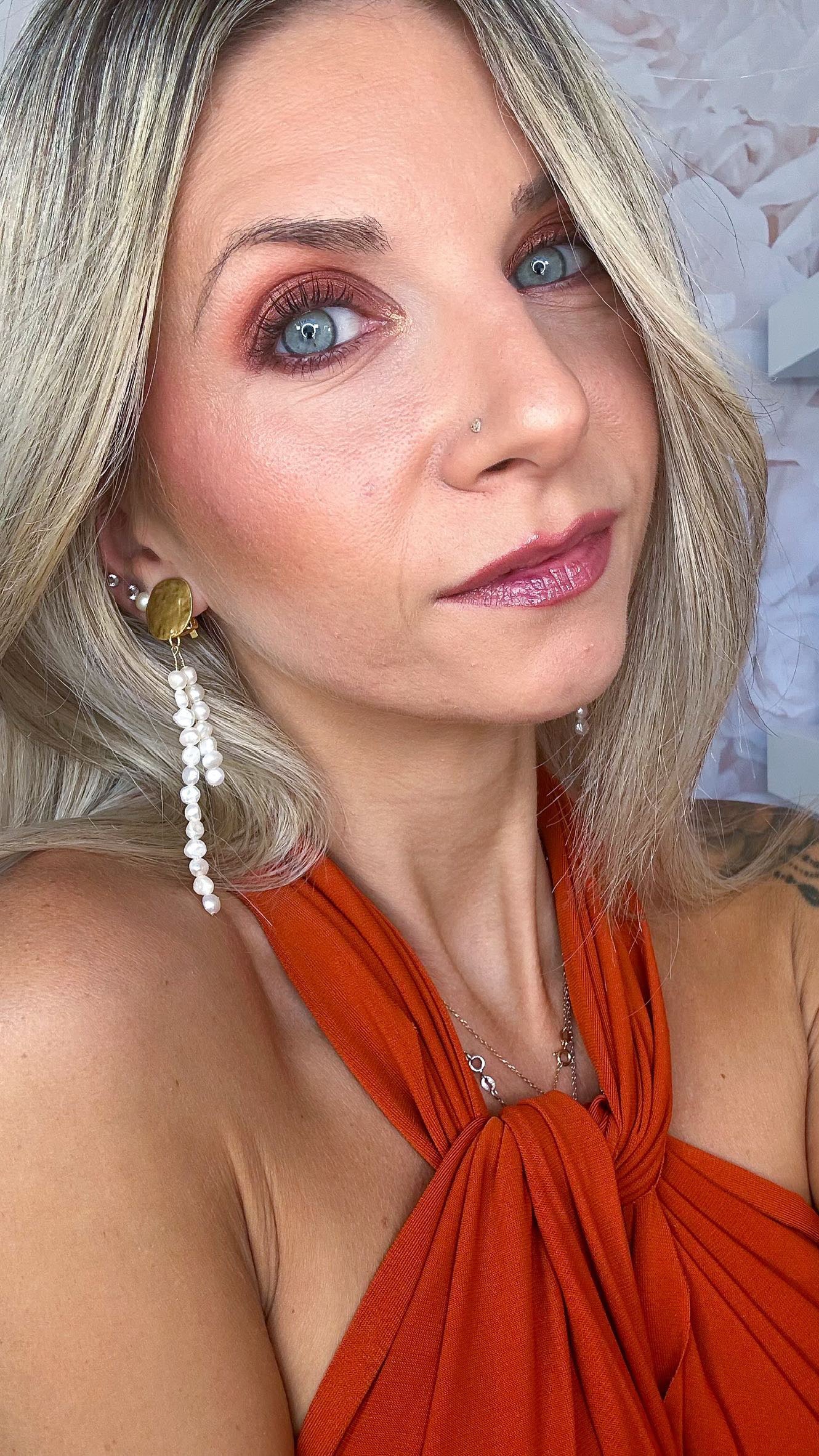 Matériaux : Base en alliage d'étain plaquée or 24 carats/argent sterling. Perles d'eau douce