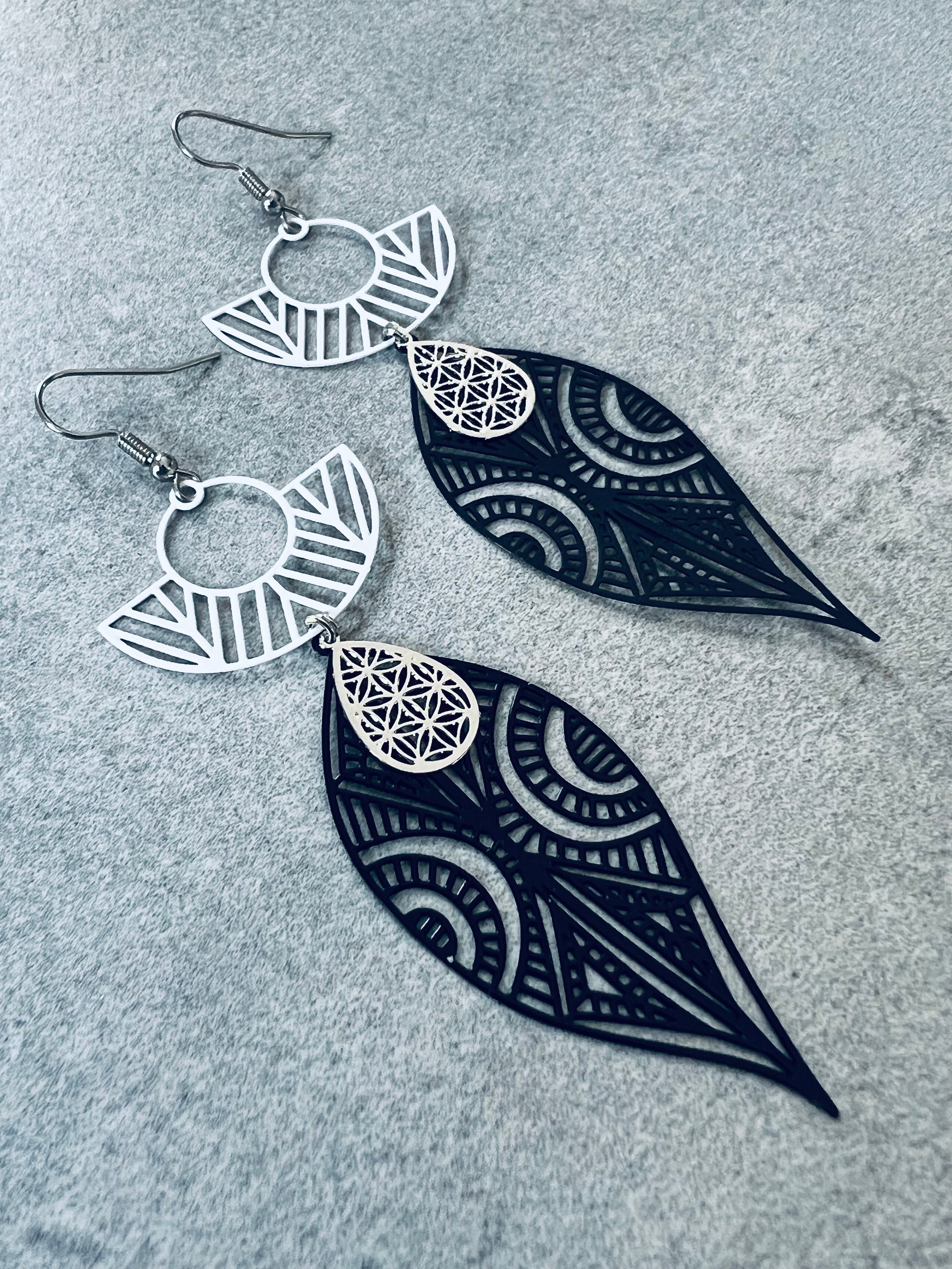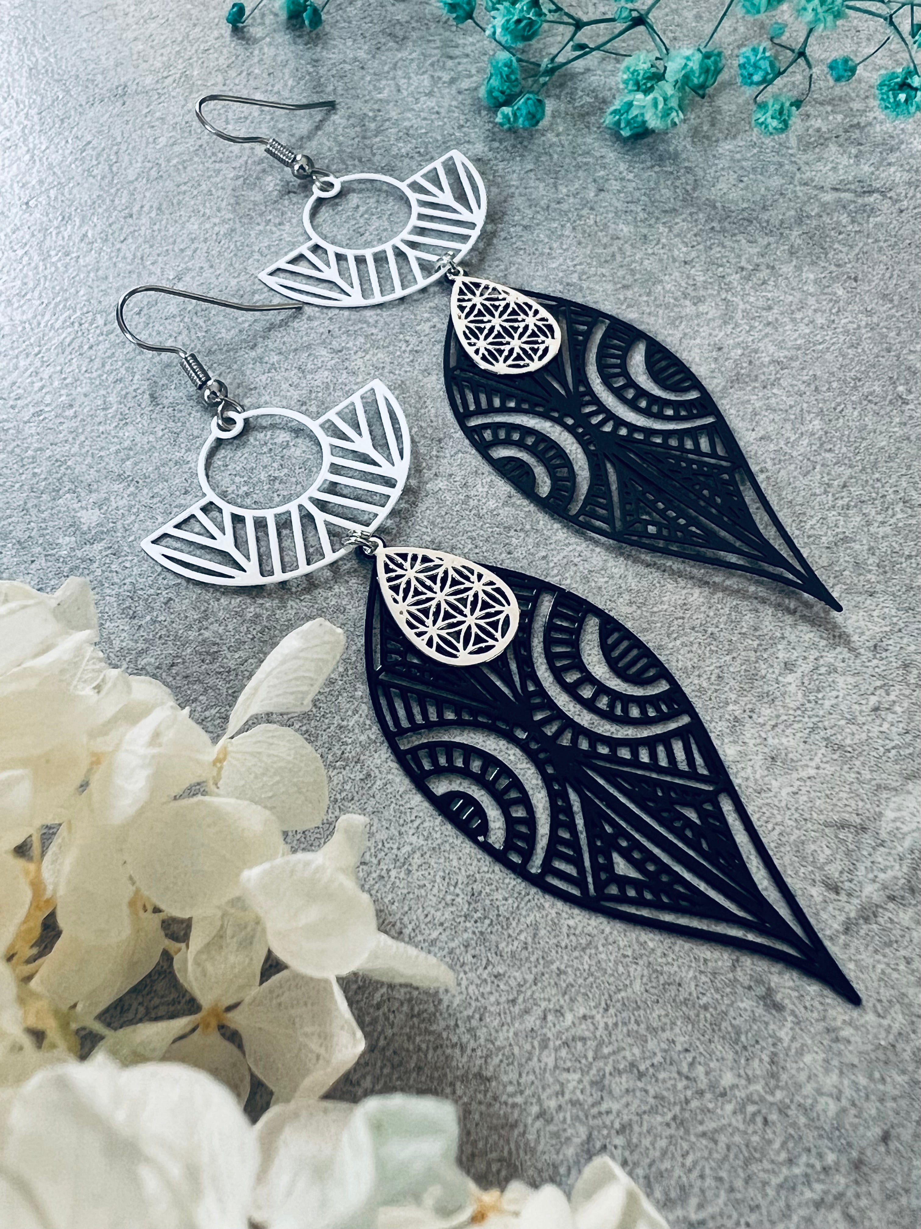 Boucles d’oreilles MAGGY légères, grand modèle noir et argenté - Créations Uniques