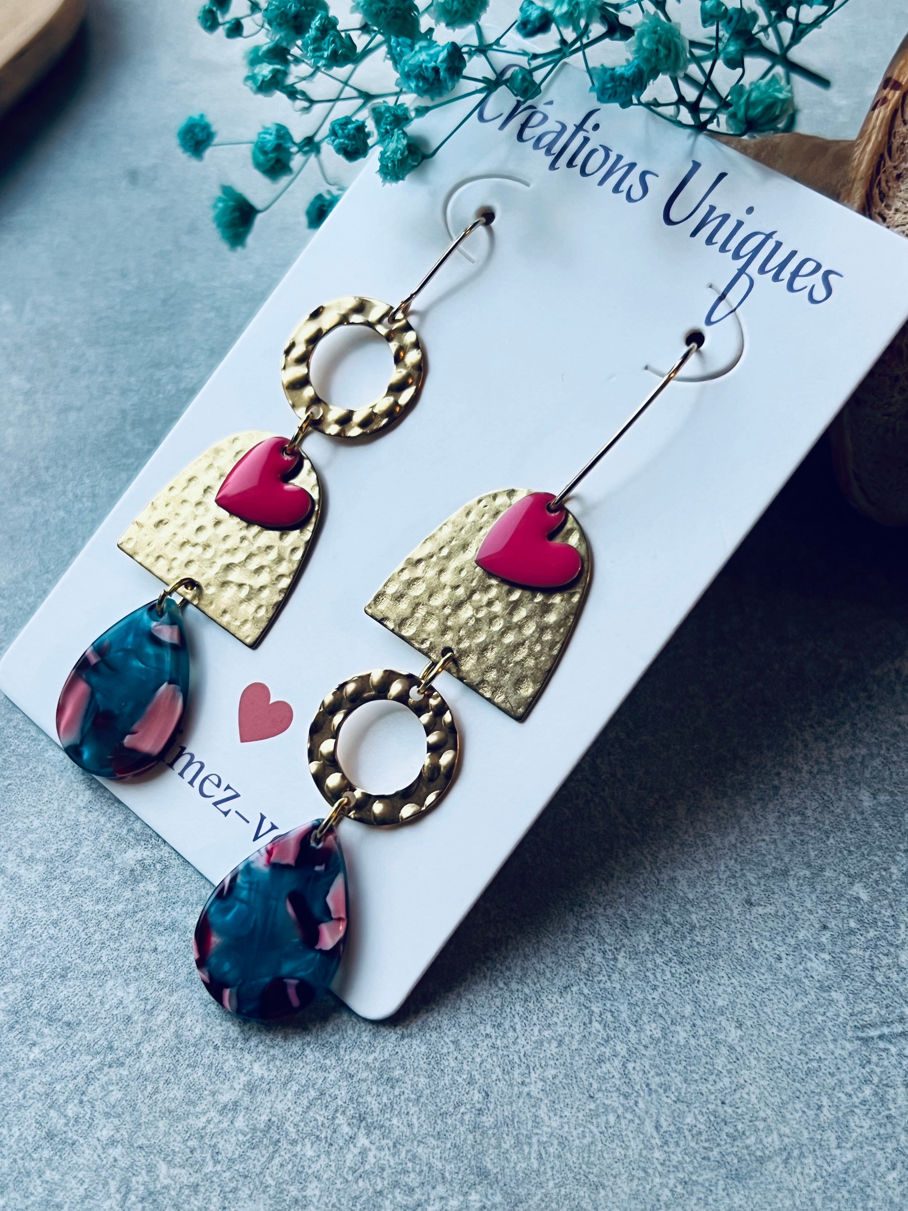 Boucles d’oreilles MARISCA asymétriques cœurs cristal Bermudes et fleurs hibiscus - Créations Uniques