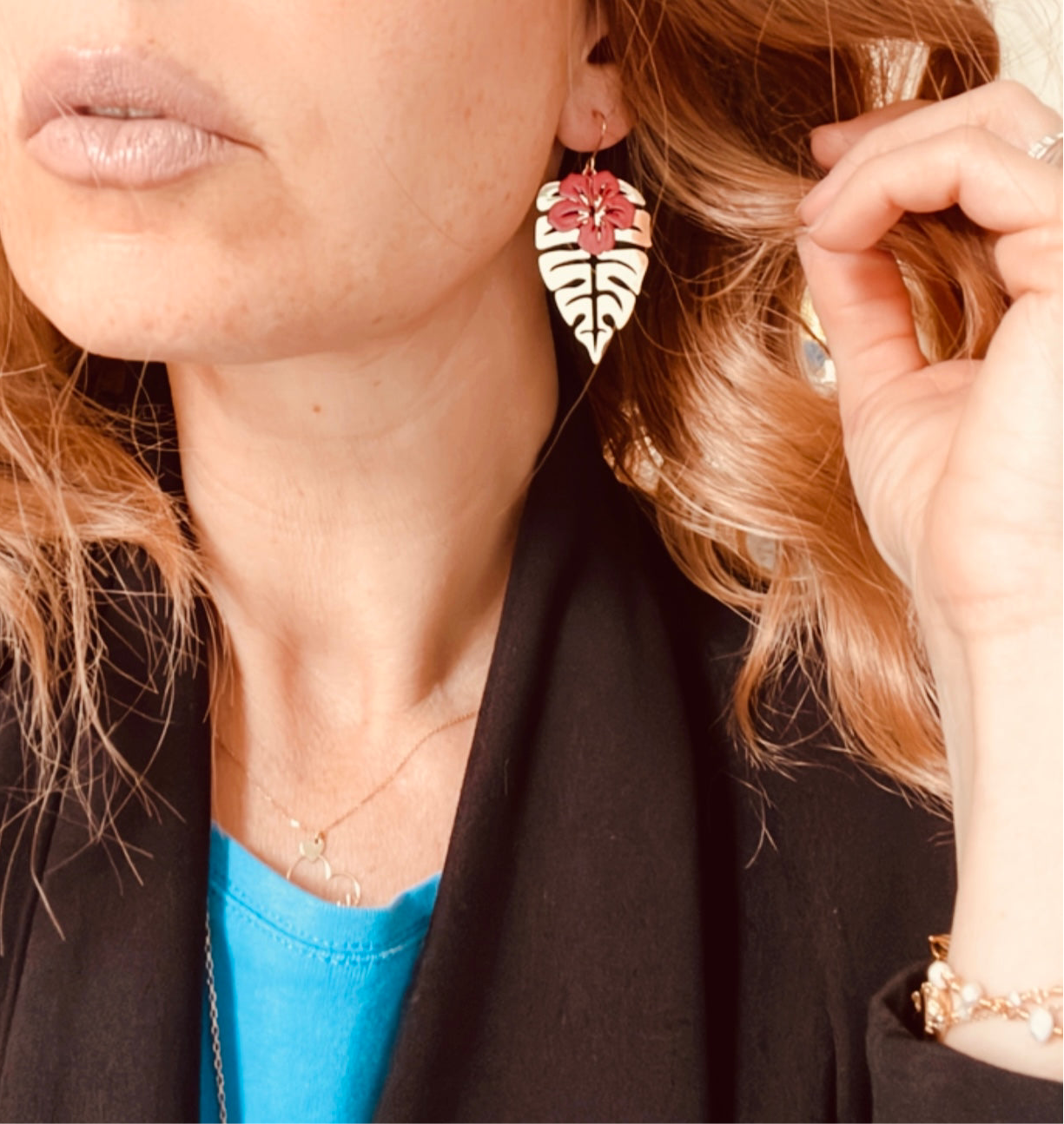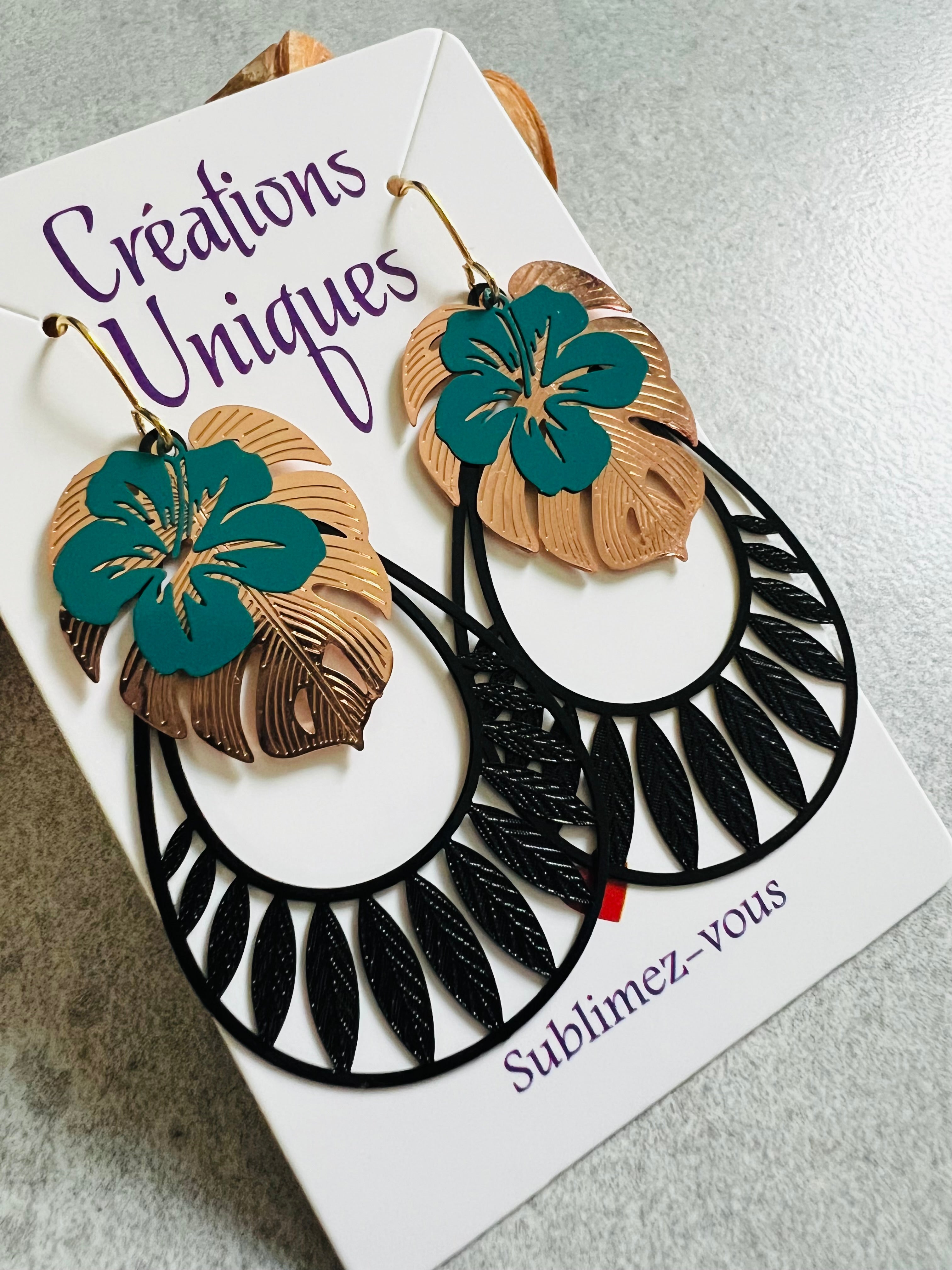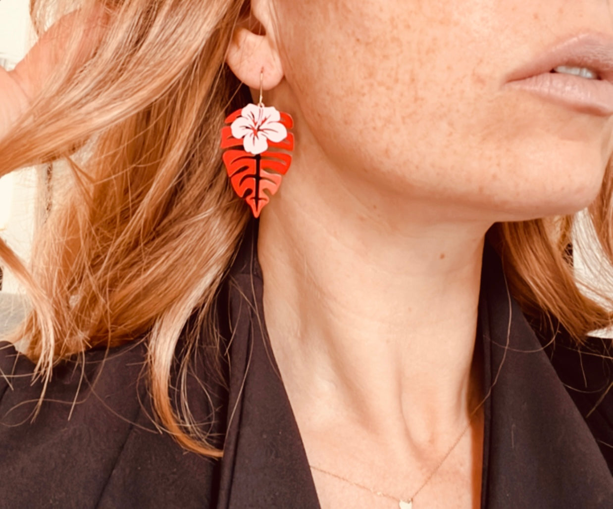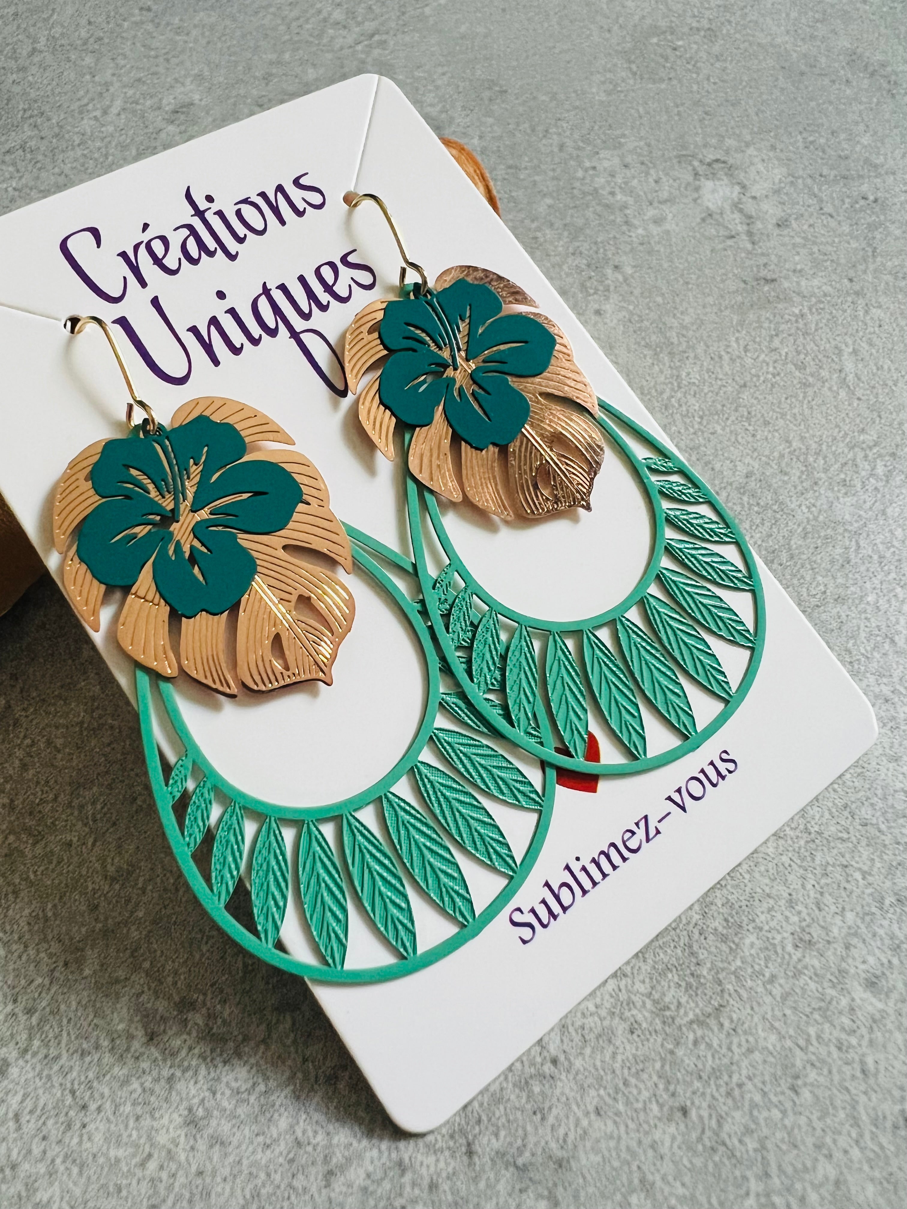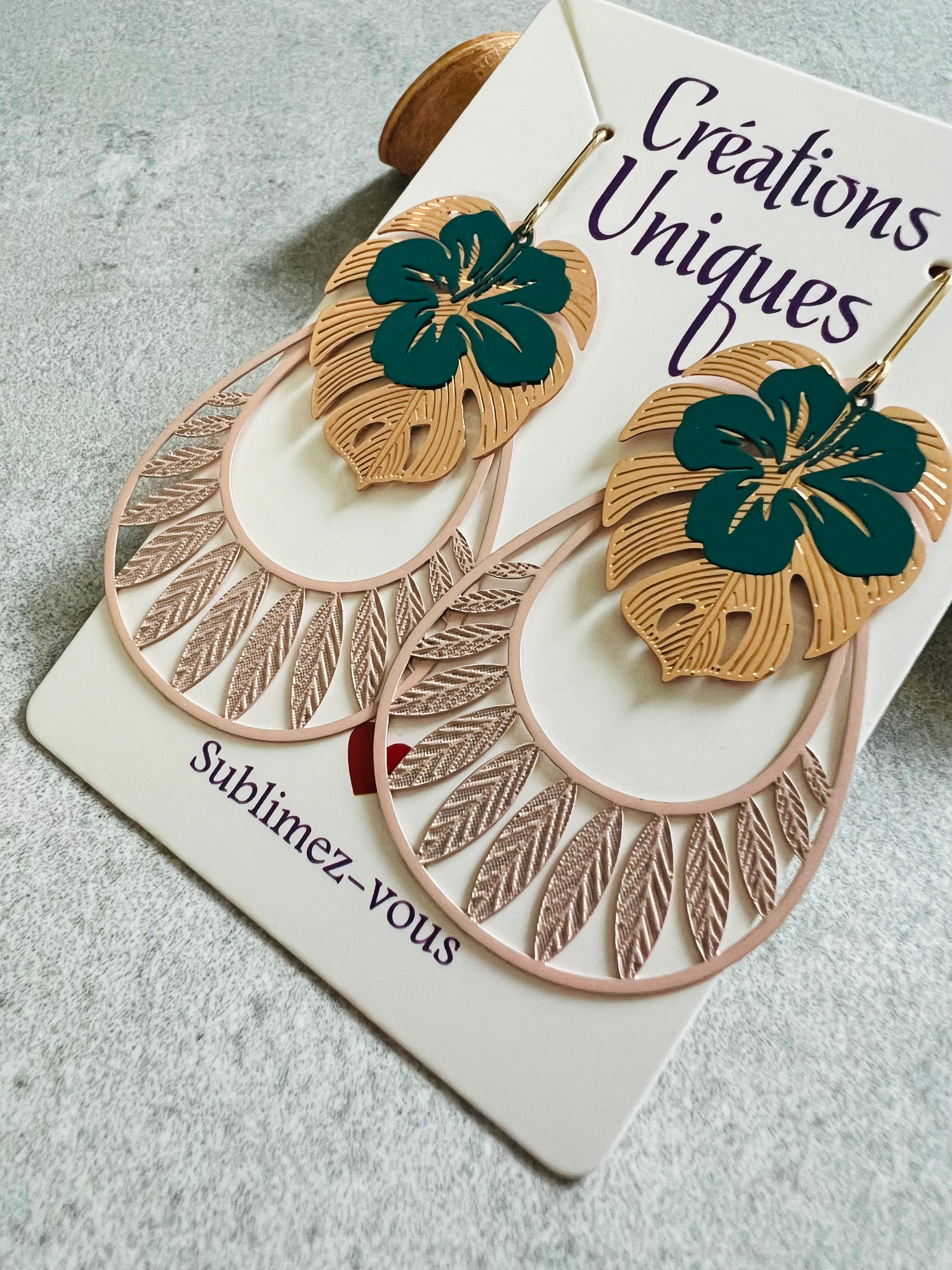 Boucles d’oreilles MARGARET feuilles tropicales et hibiscus - Créations Uniques