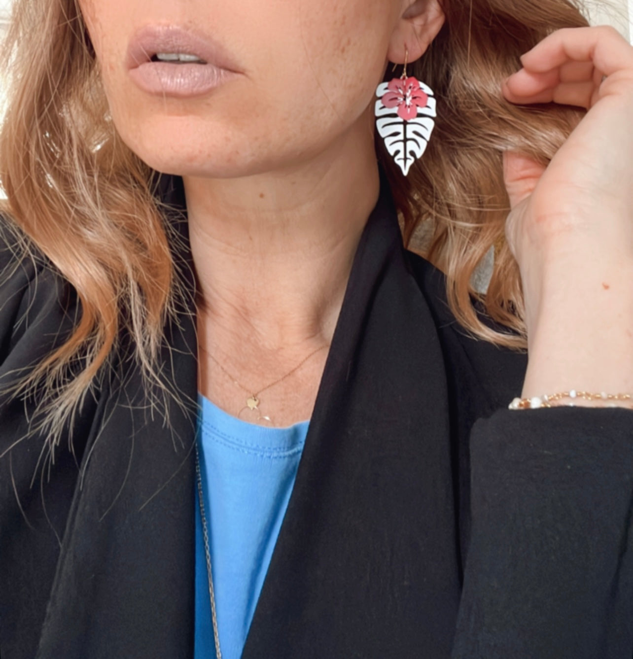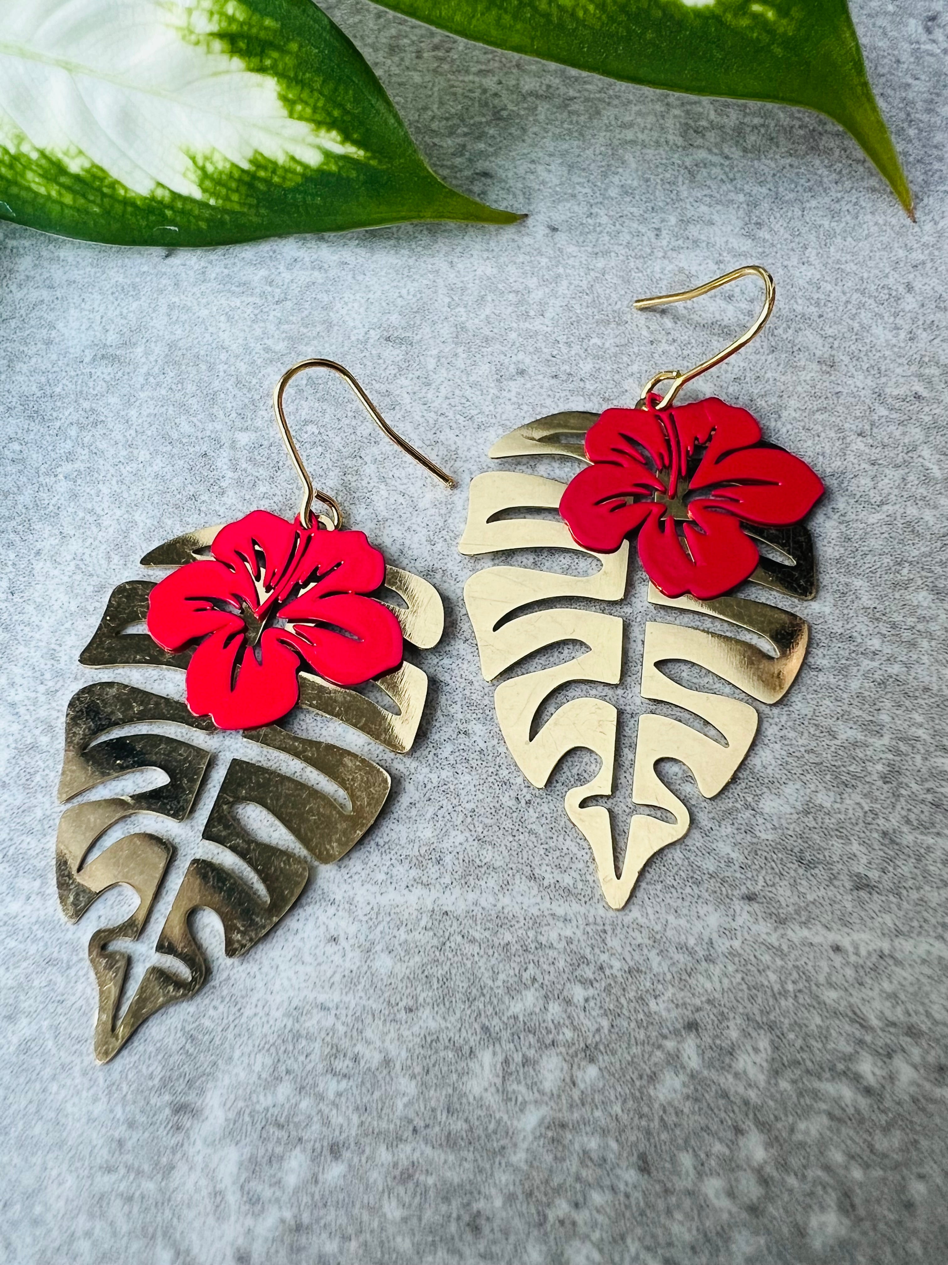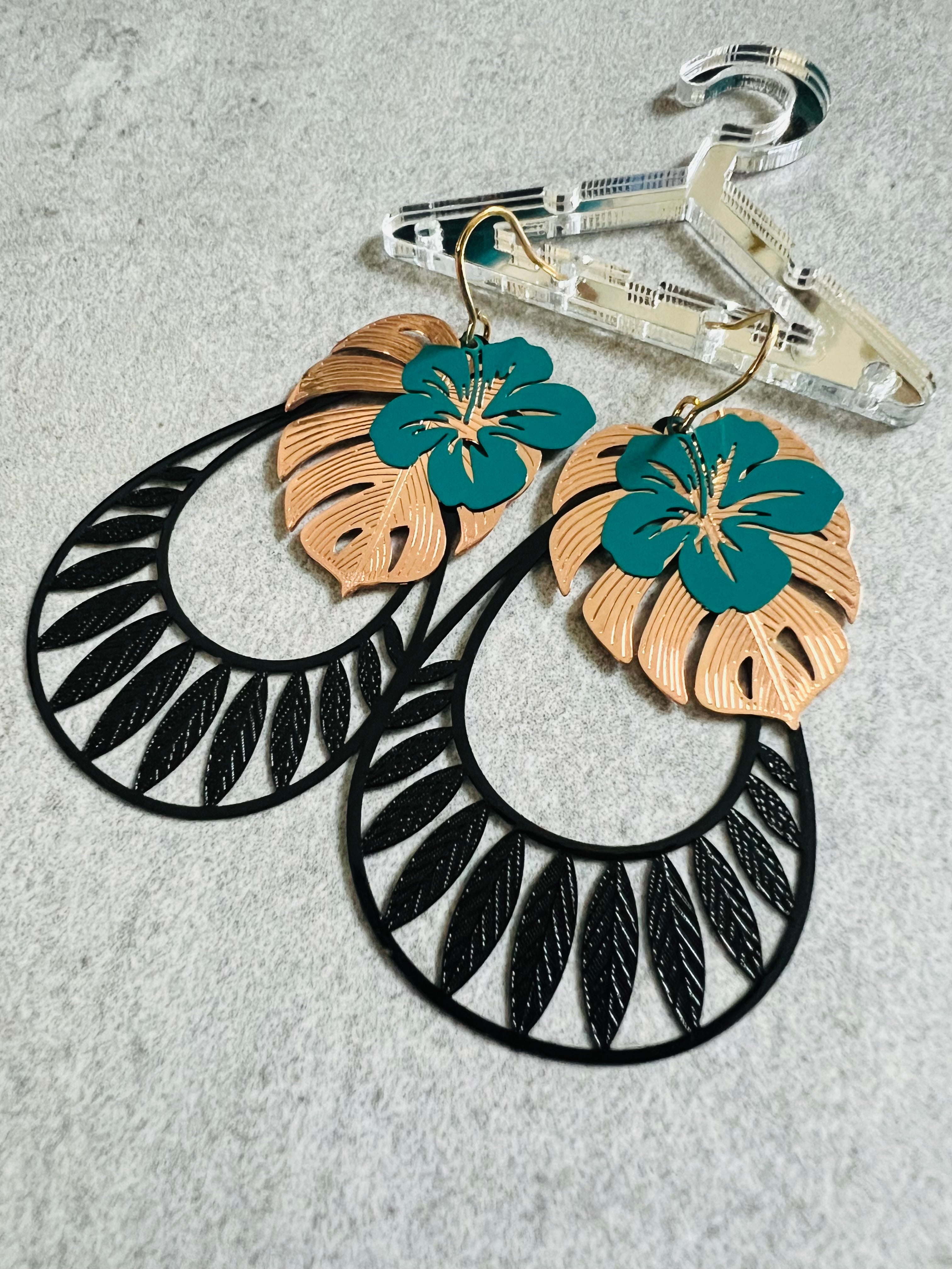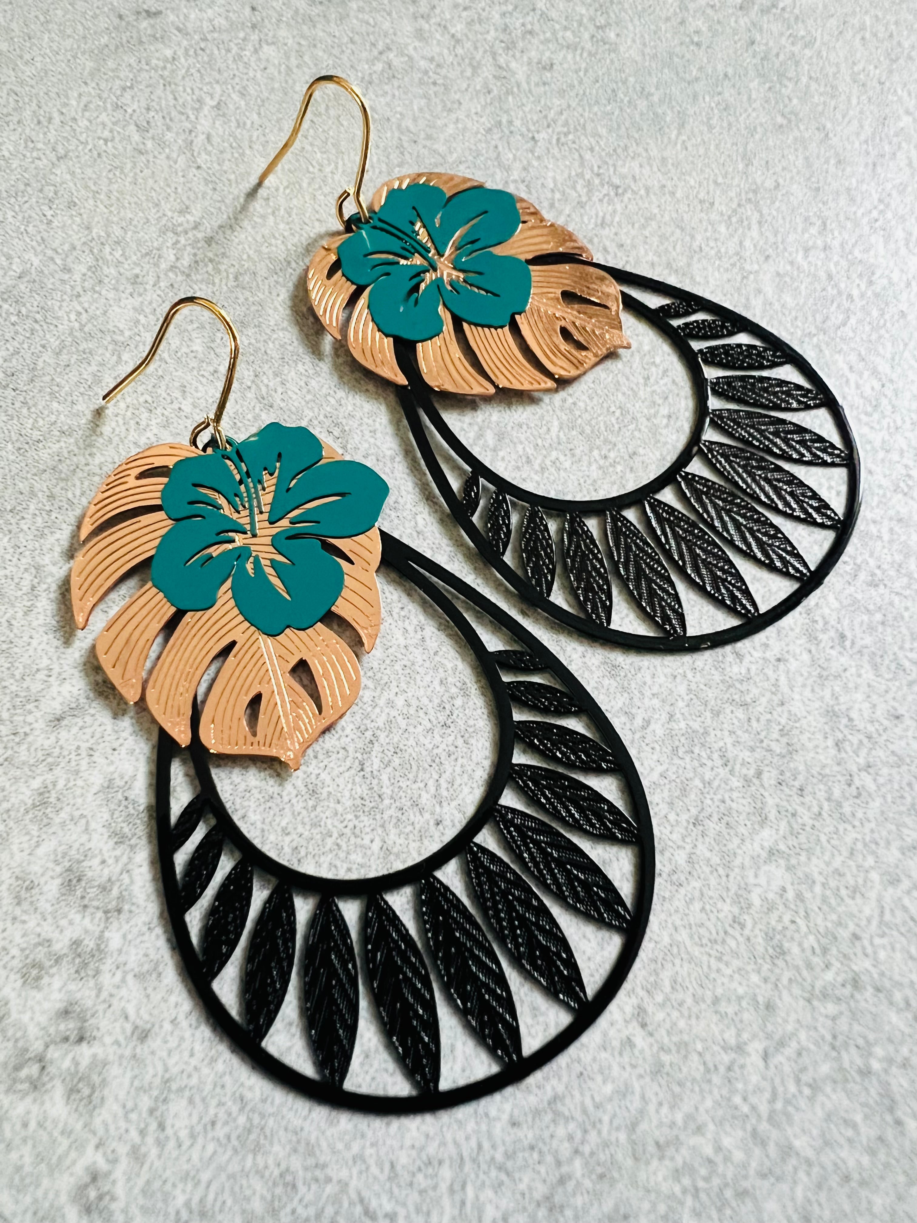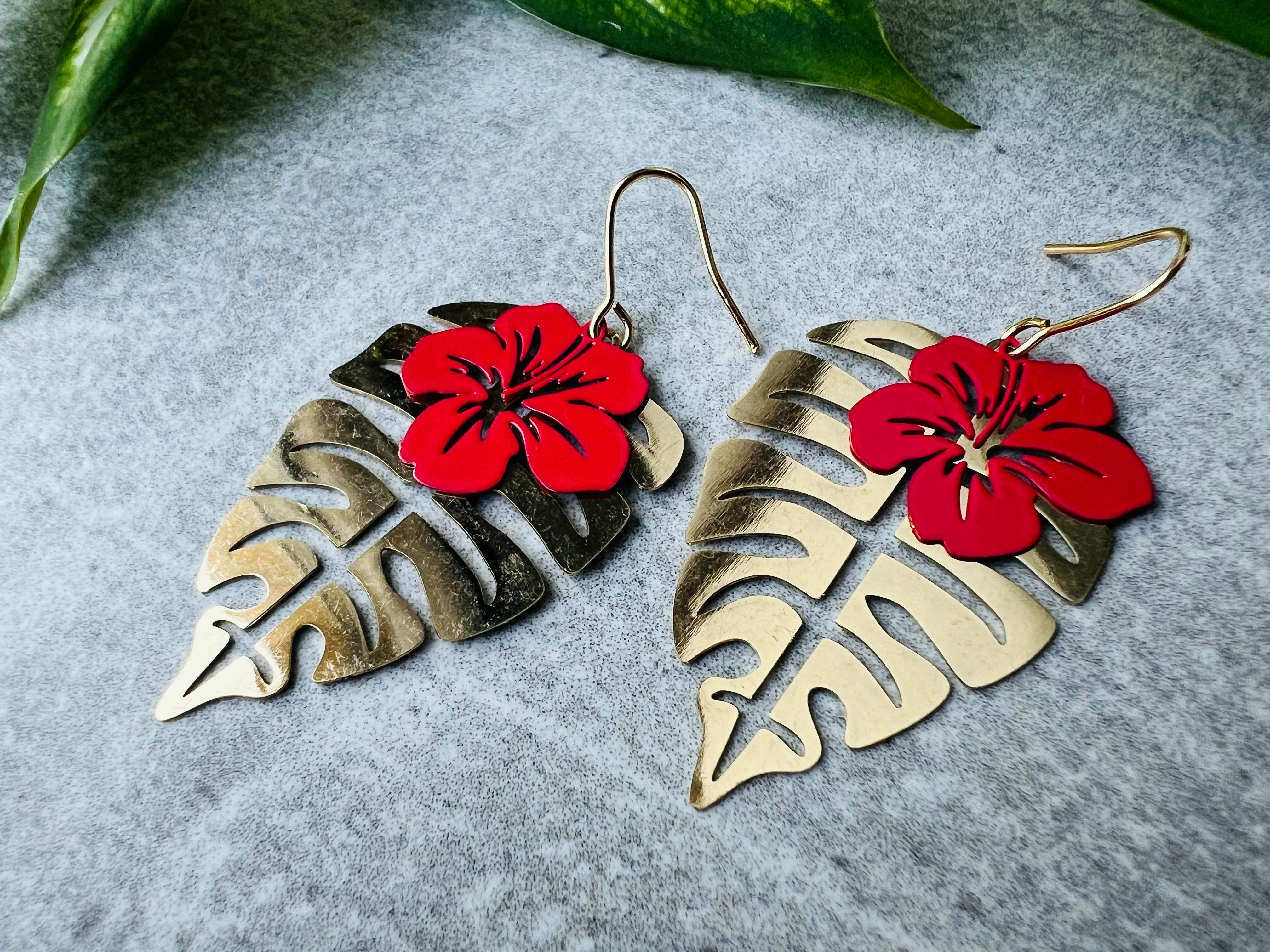 Boucles d’oreilles MARGARET feuilles tropicales et hibiscus - Créations Uniques