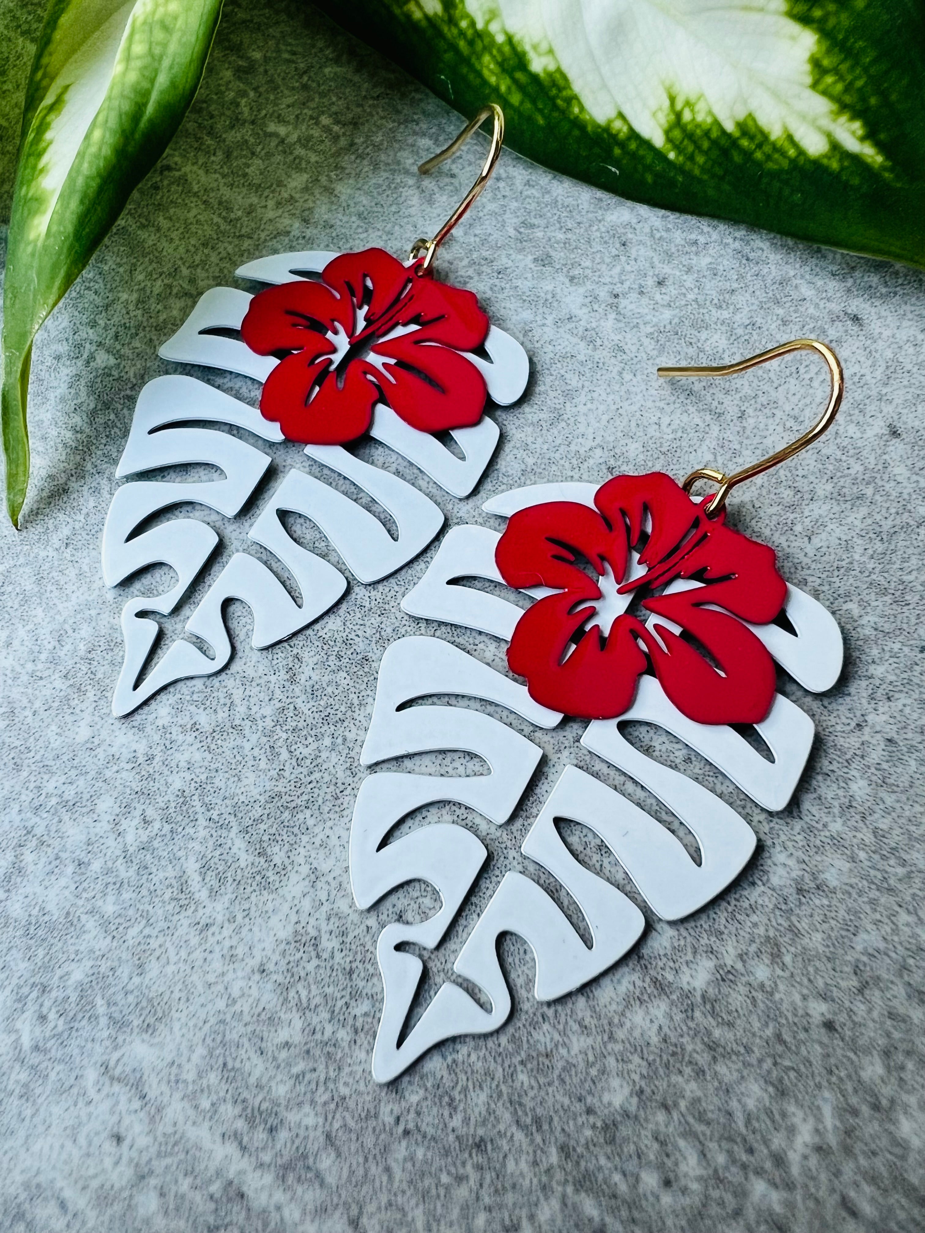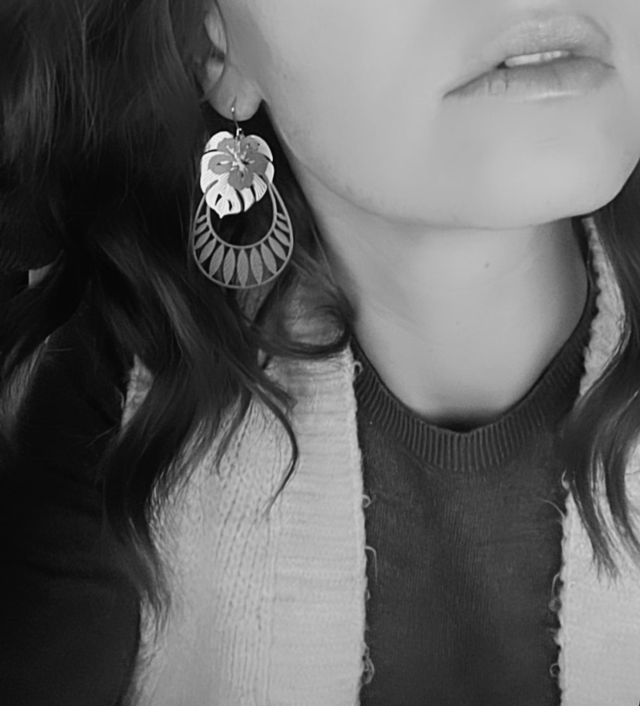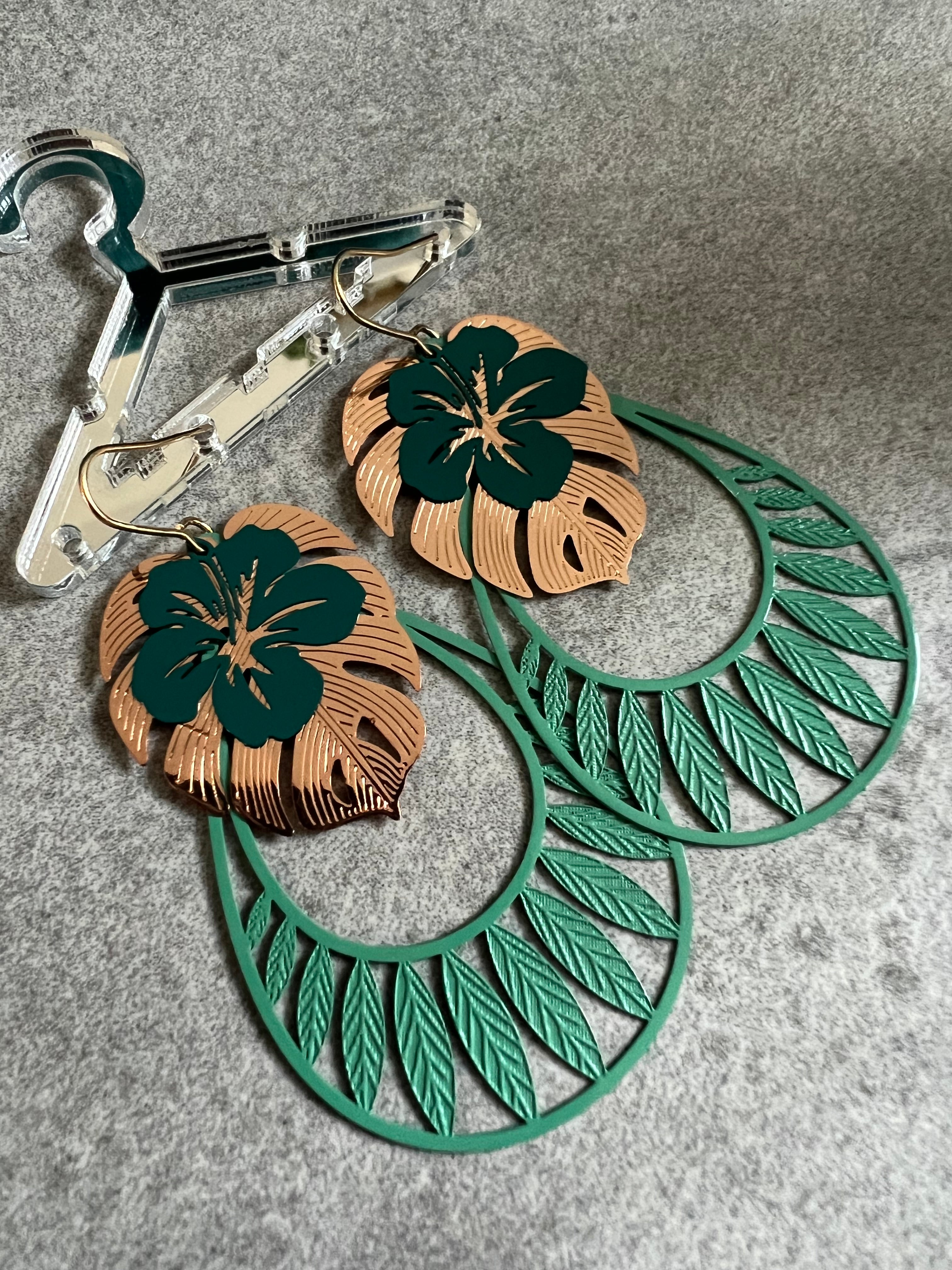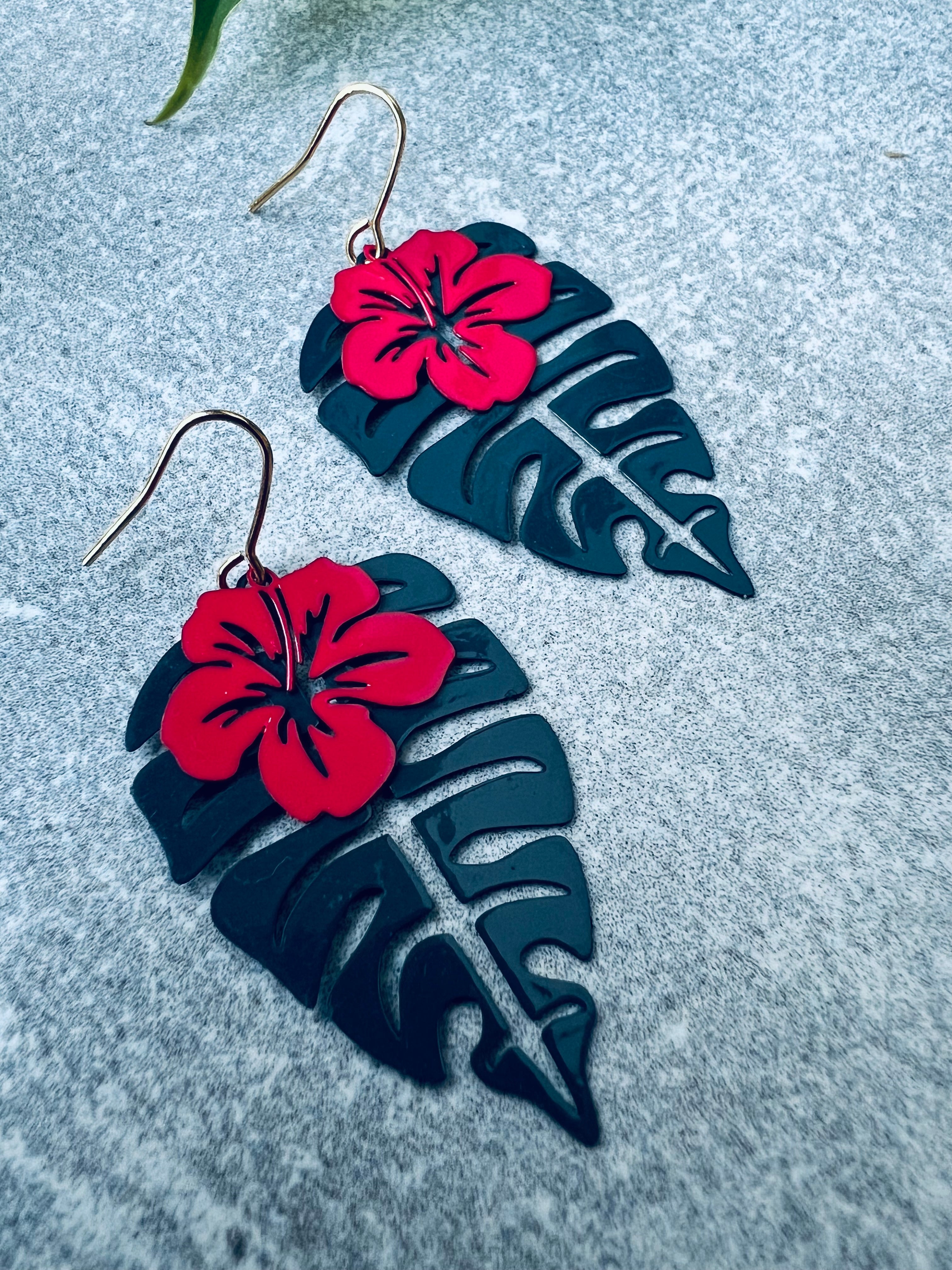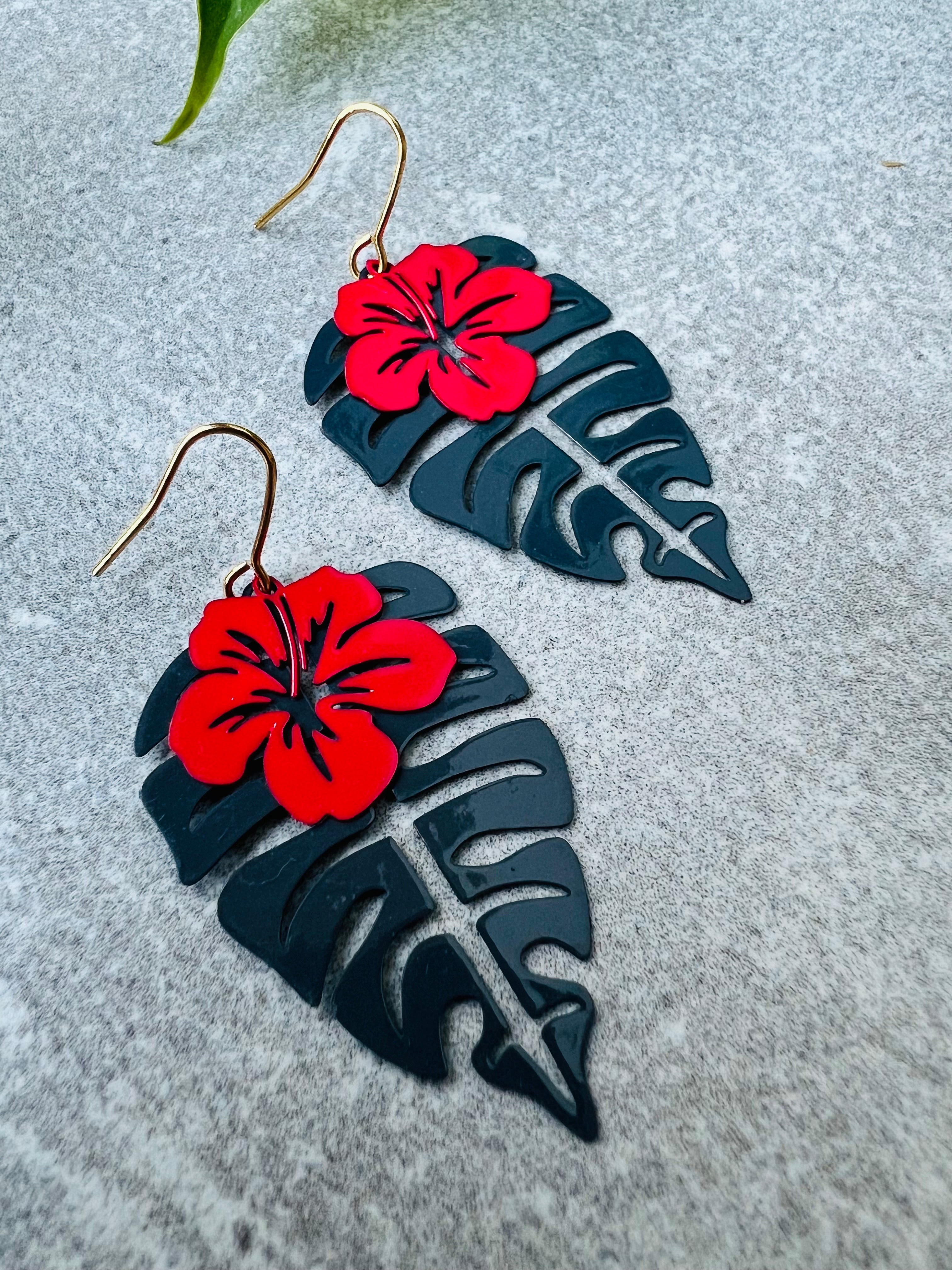 Boucles d’oreilles MARGARET feuilles tropicales et hibiscus - Créations Uniques