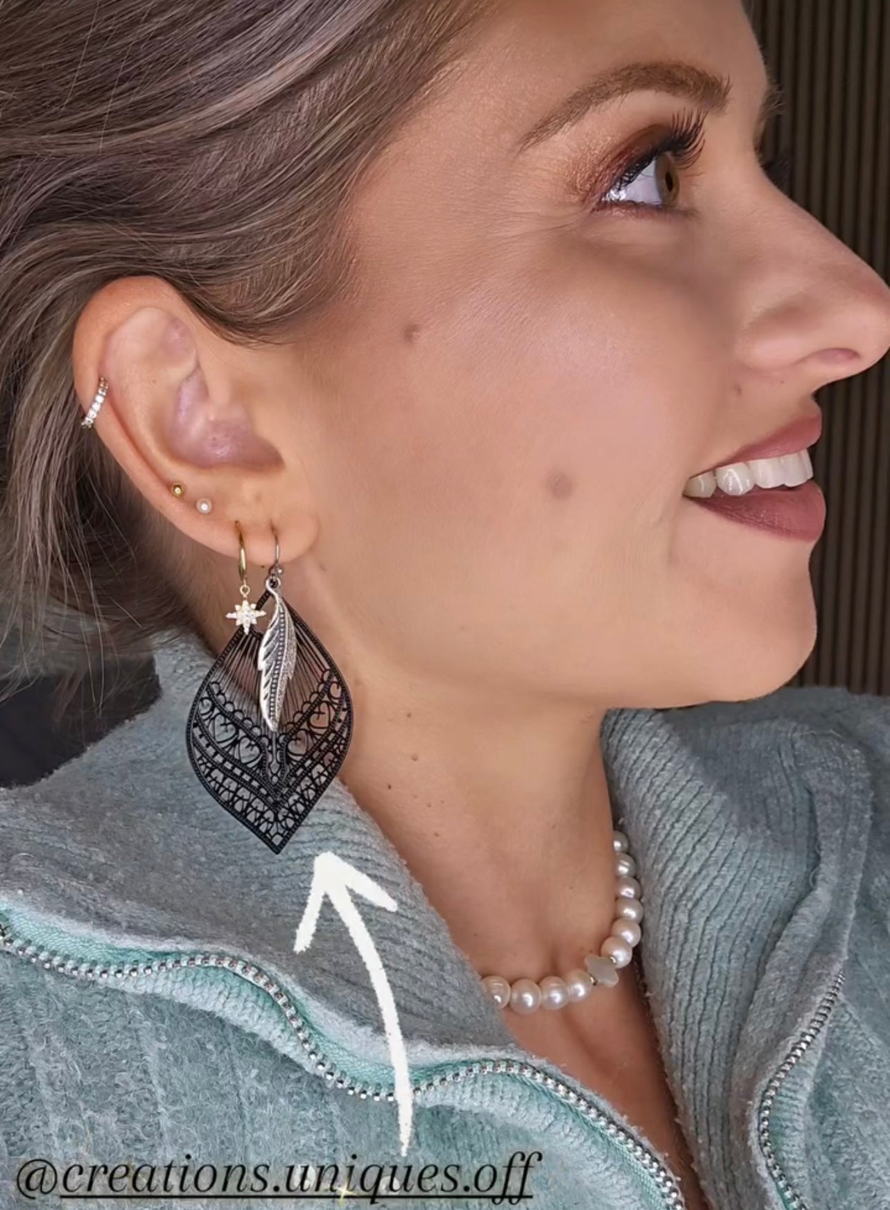 Boucles d’oreilles NINA gouttes noires et plumes argentées - Créations Uniques