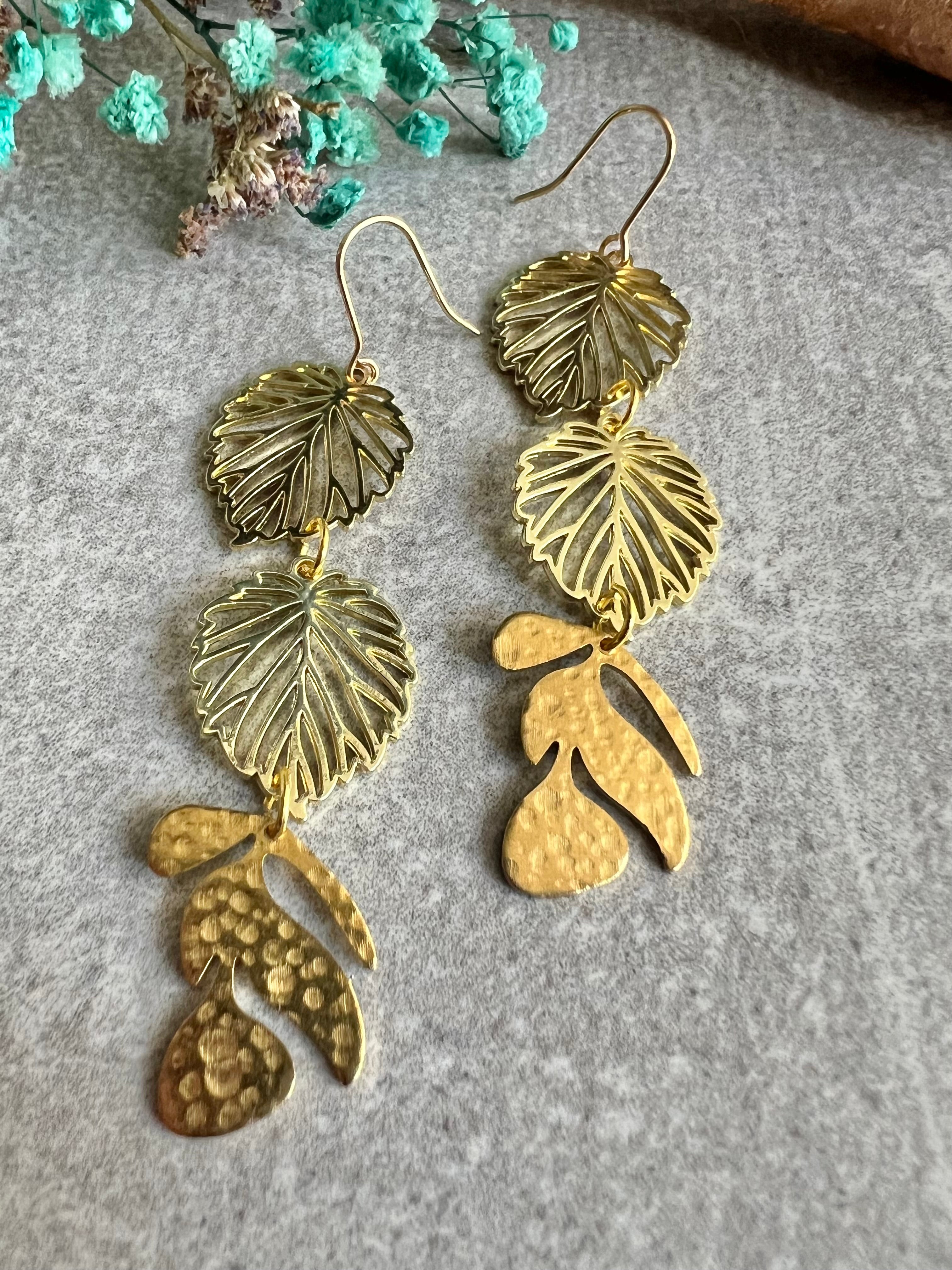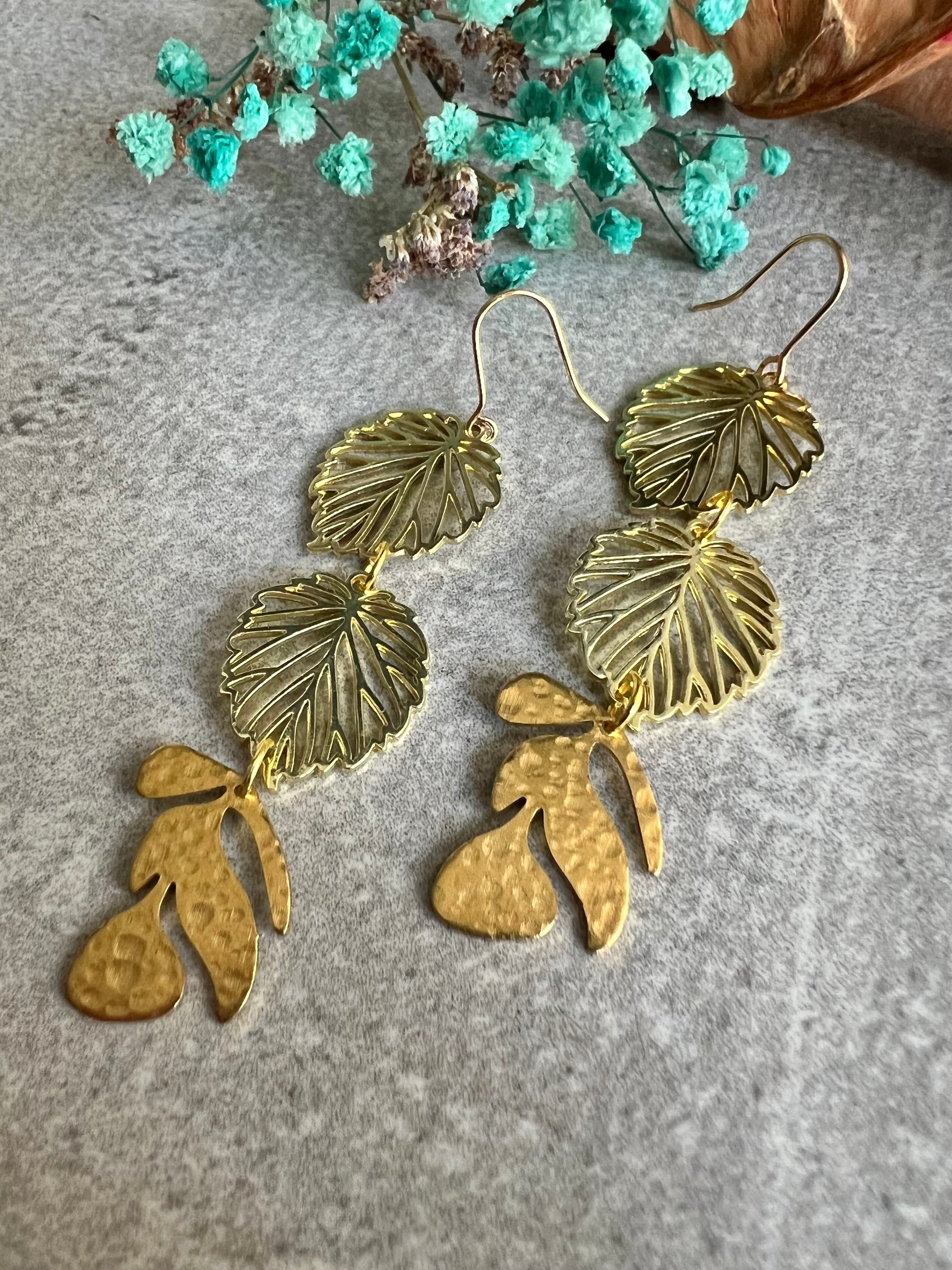 Boucles d’oreilles CLAUDINE trois feuilles dorées - Créations Uniques