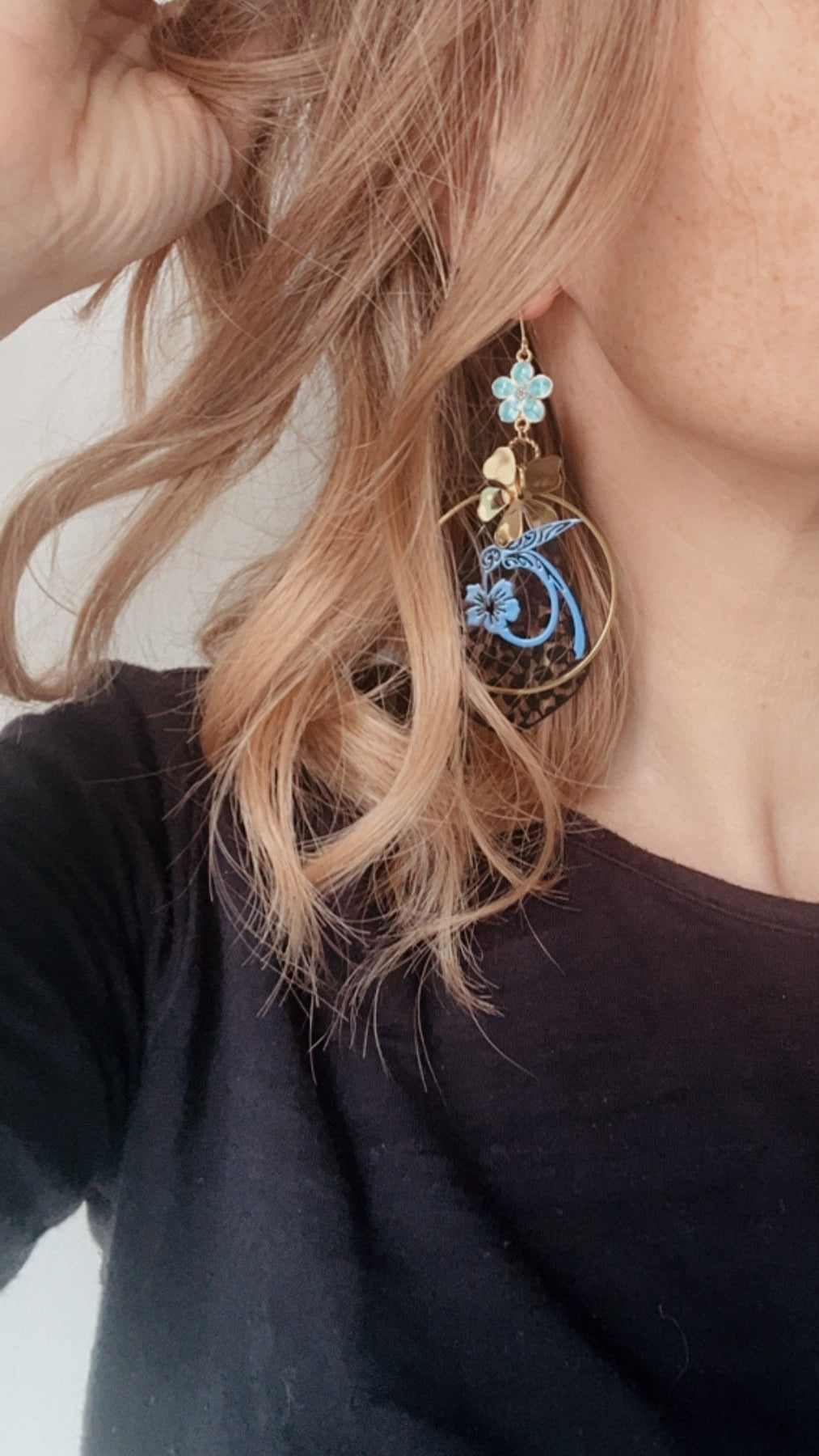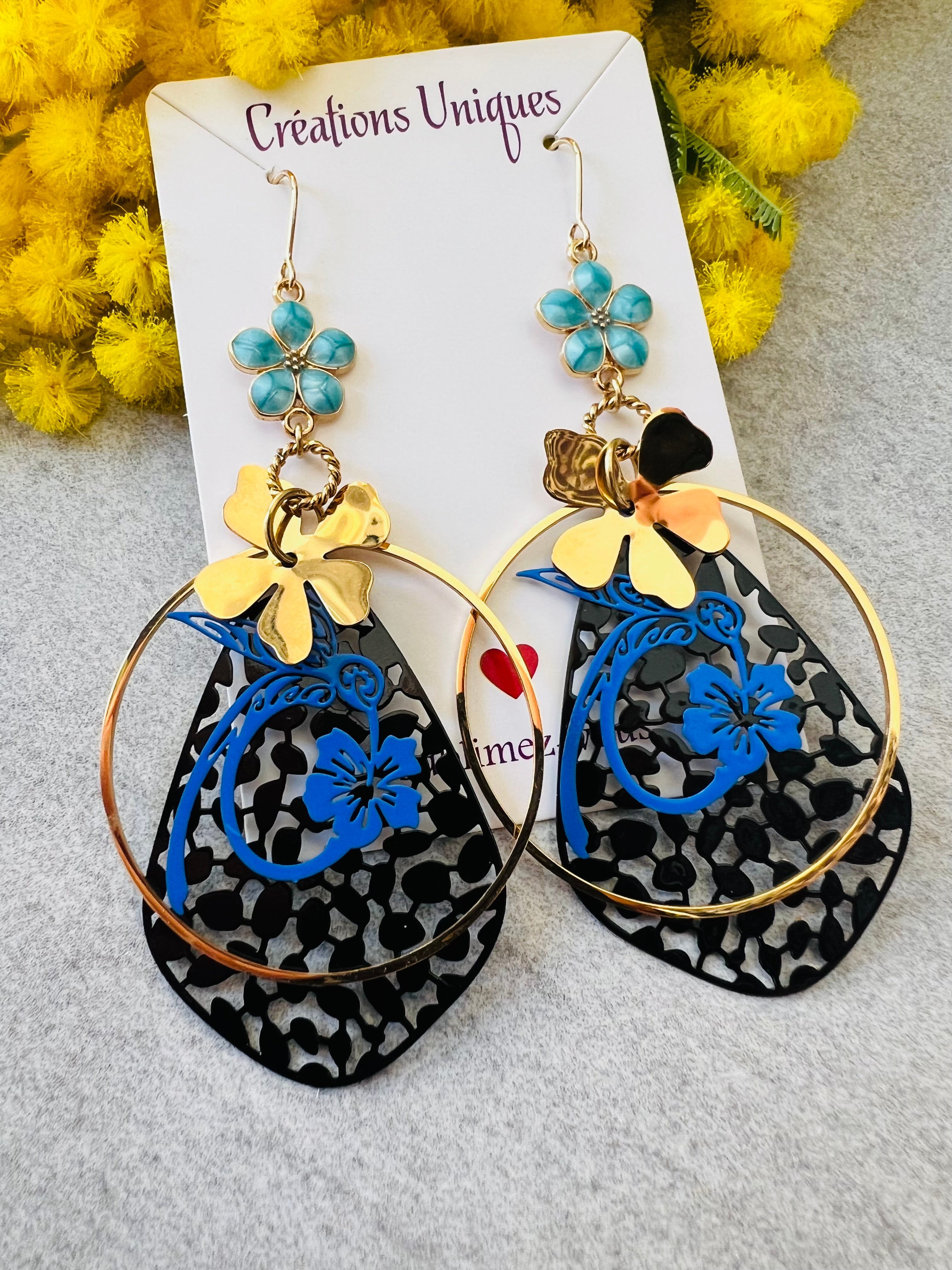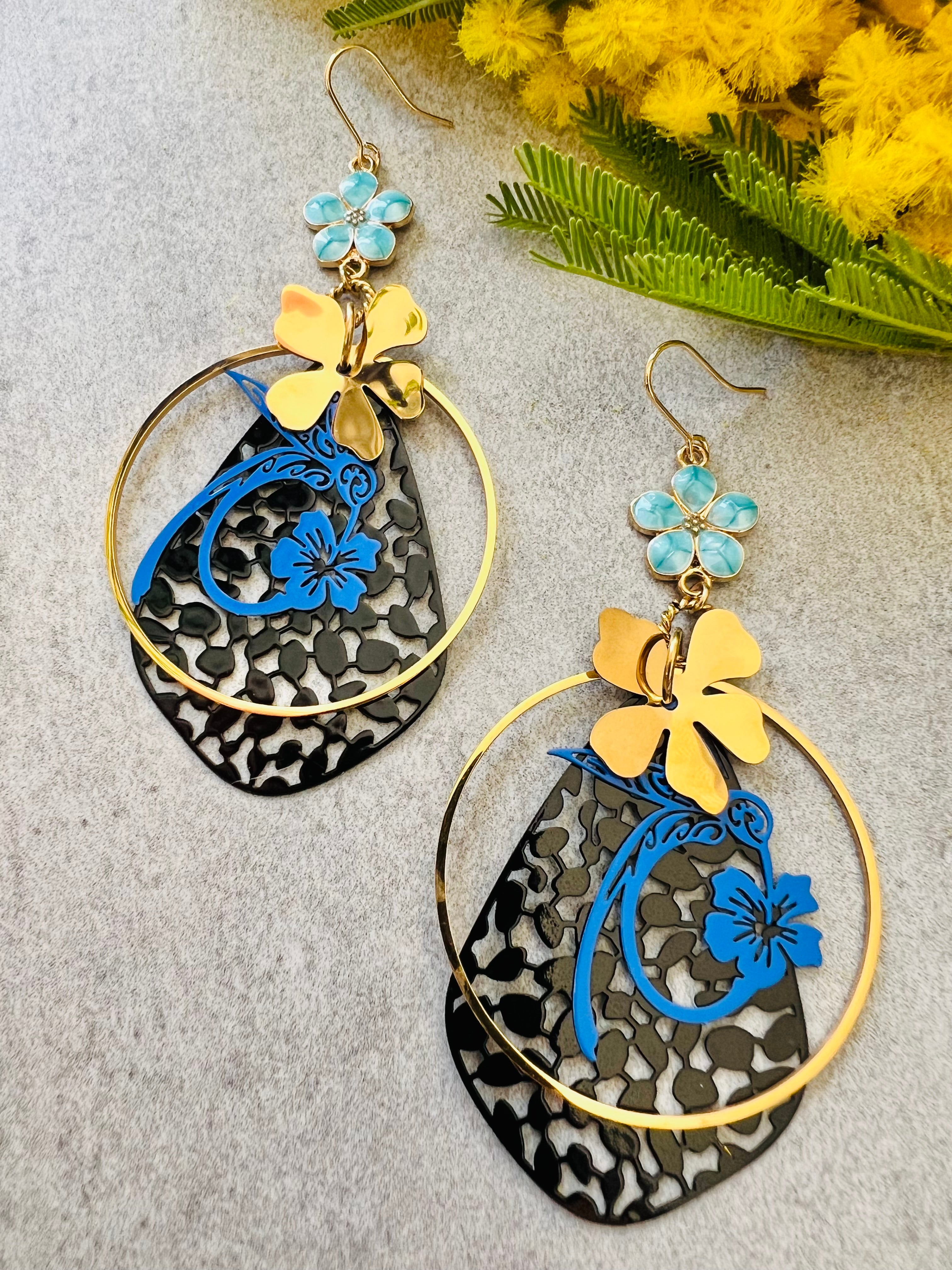 Boucles d’oreilles fleurs, feuillage et colibris, style femme été HARRIET - Créations Uniques
