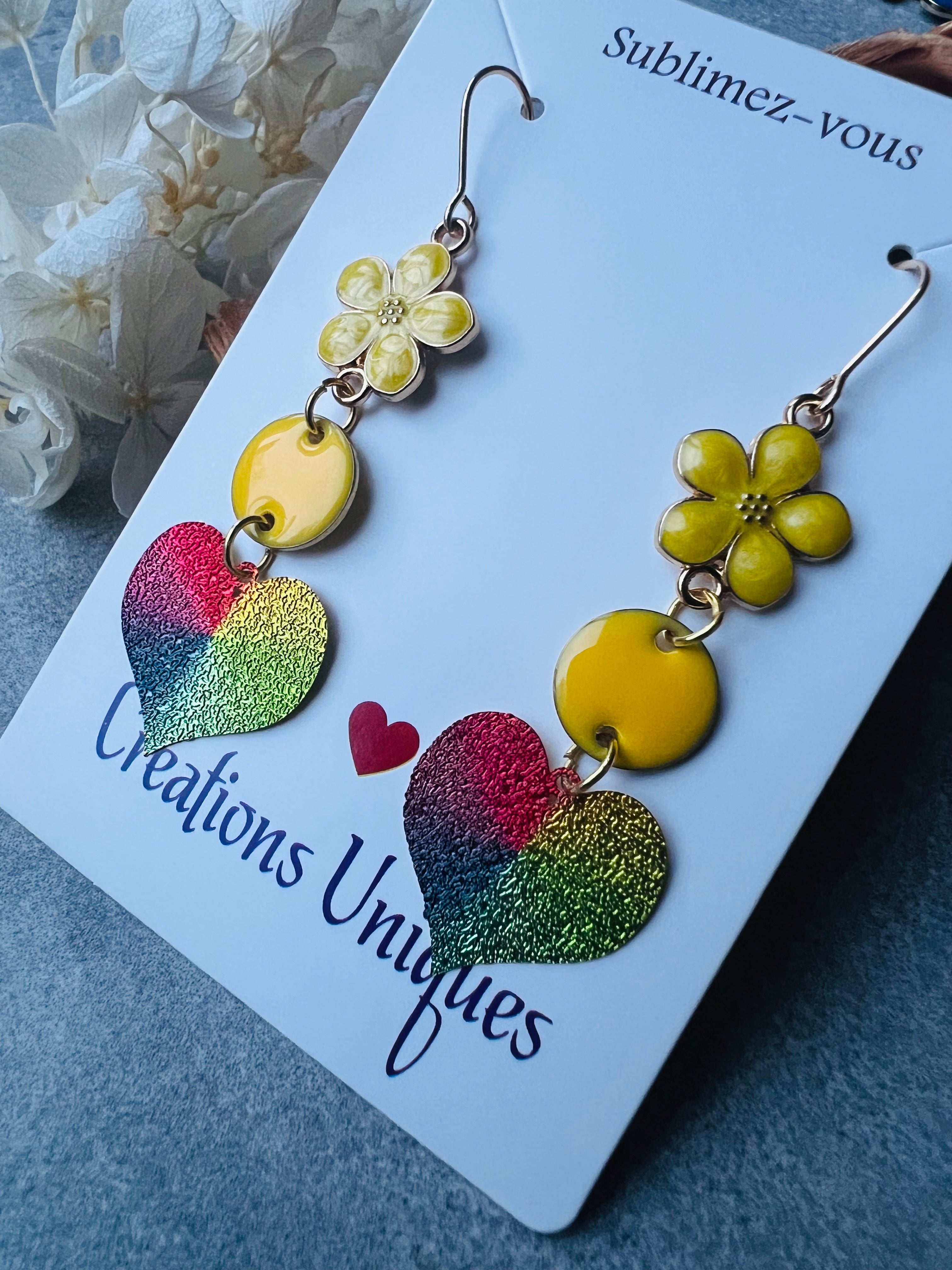 • Cœurs multicolores et fleurs jaunes.