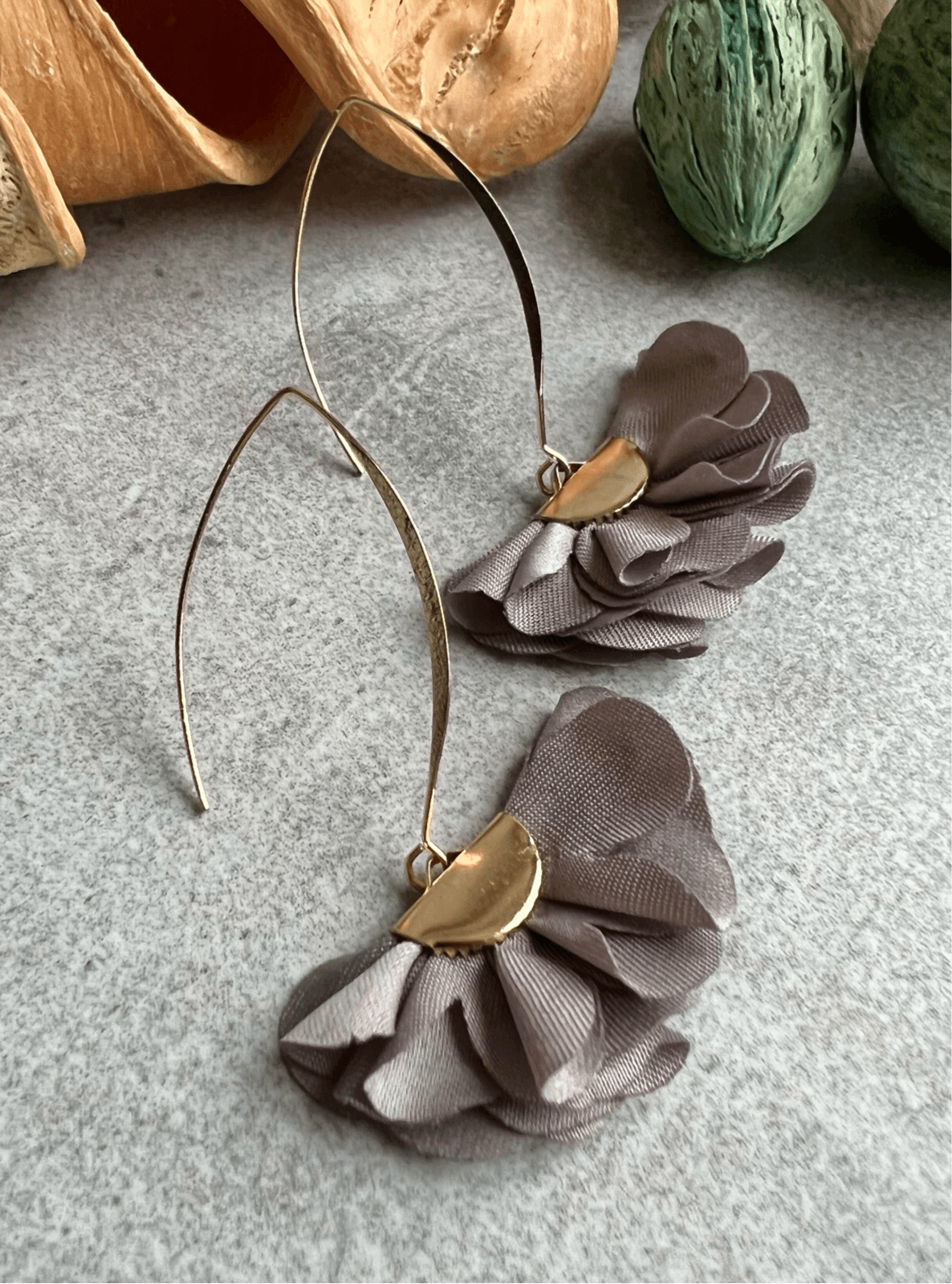 - perles anthracite 9 cm/ feuilles 5,5 cm/ créoles 5 cm/ fleurs tissu 6 cm/ clips feuilles strass 2 cm