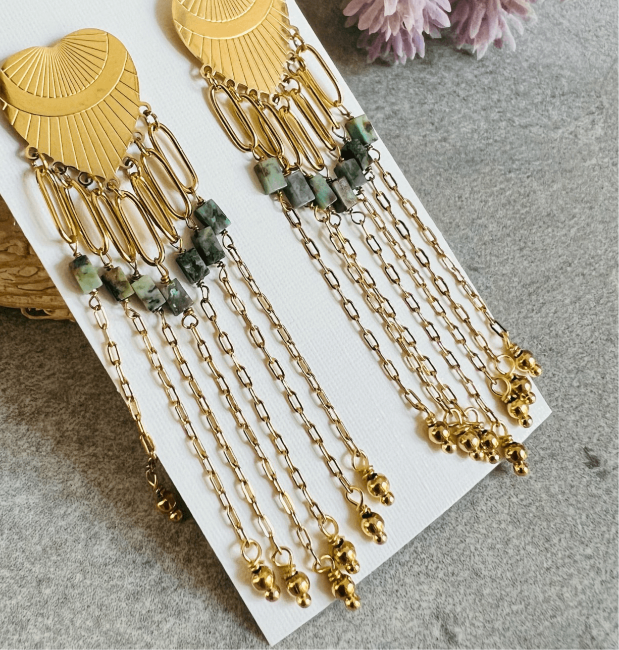 Boucles d’oreilles MADDIE style bohème, cœurs, perles turquoise et chaînes dorées