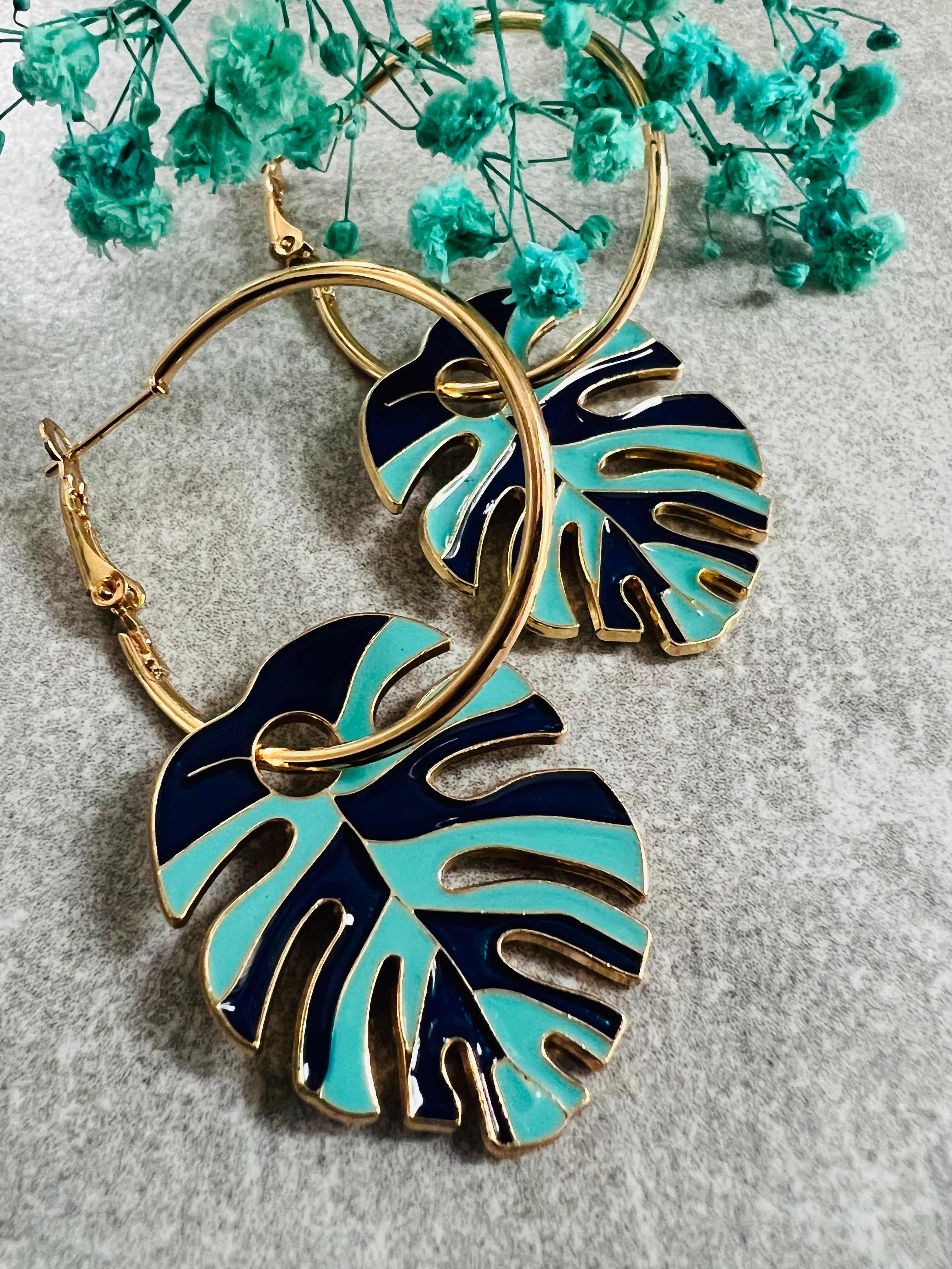Boucles d’oreilles ADELINE style bohème, feuilles tropicales turquoise - Créations Uniques