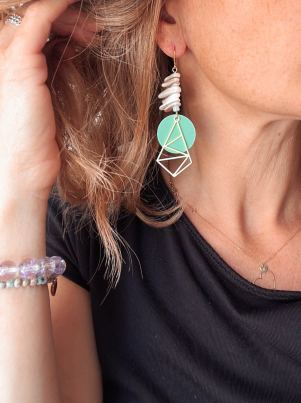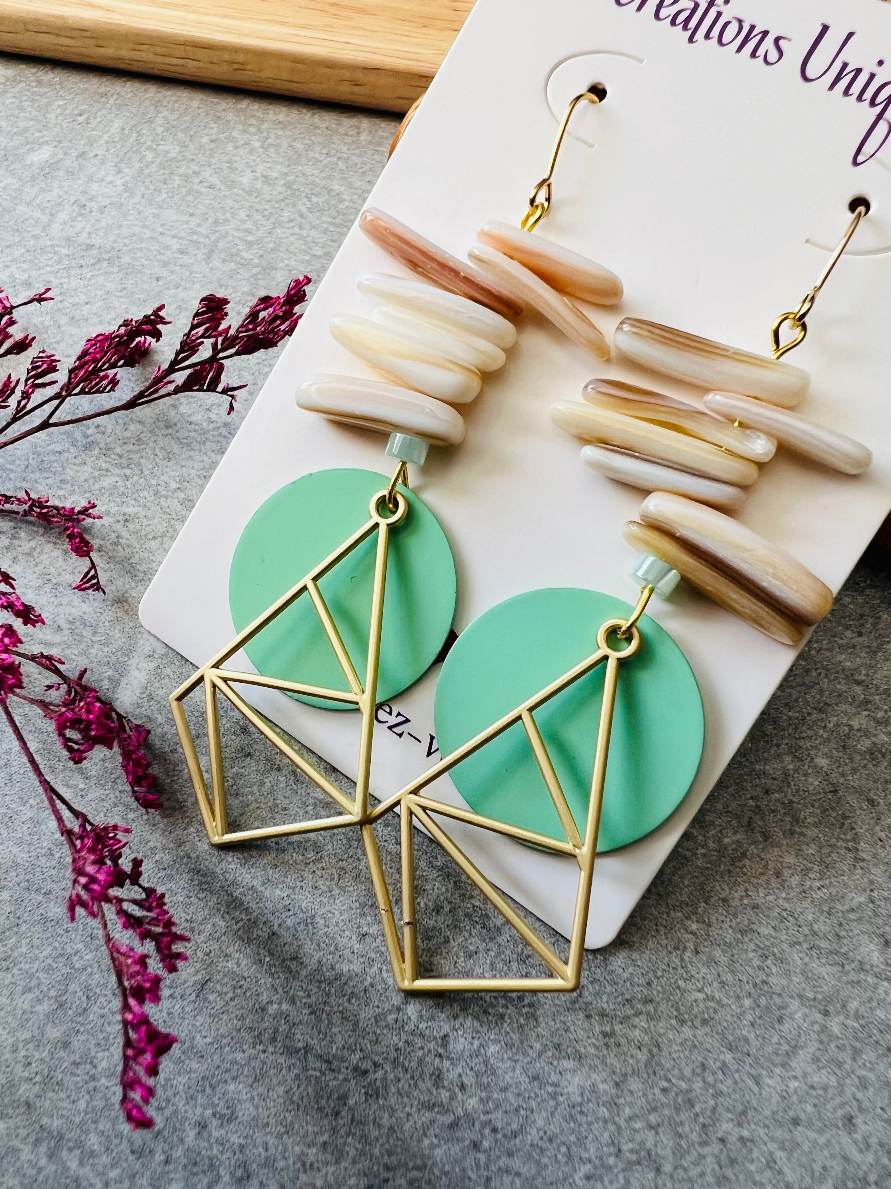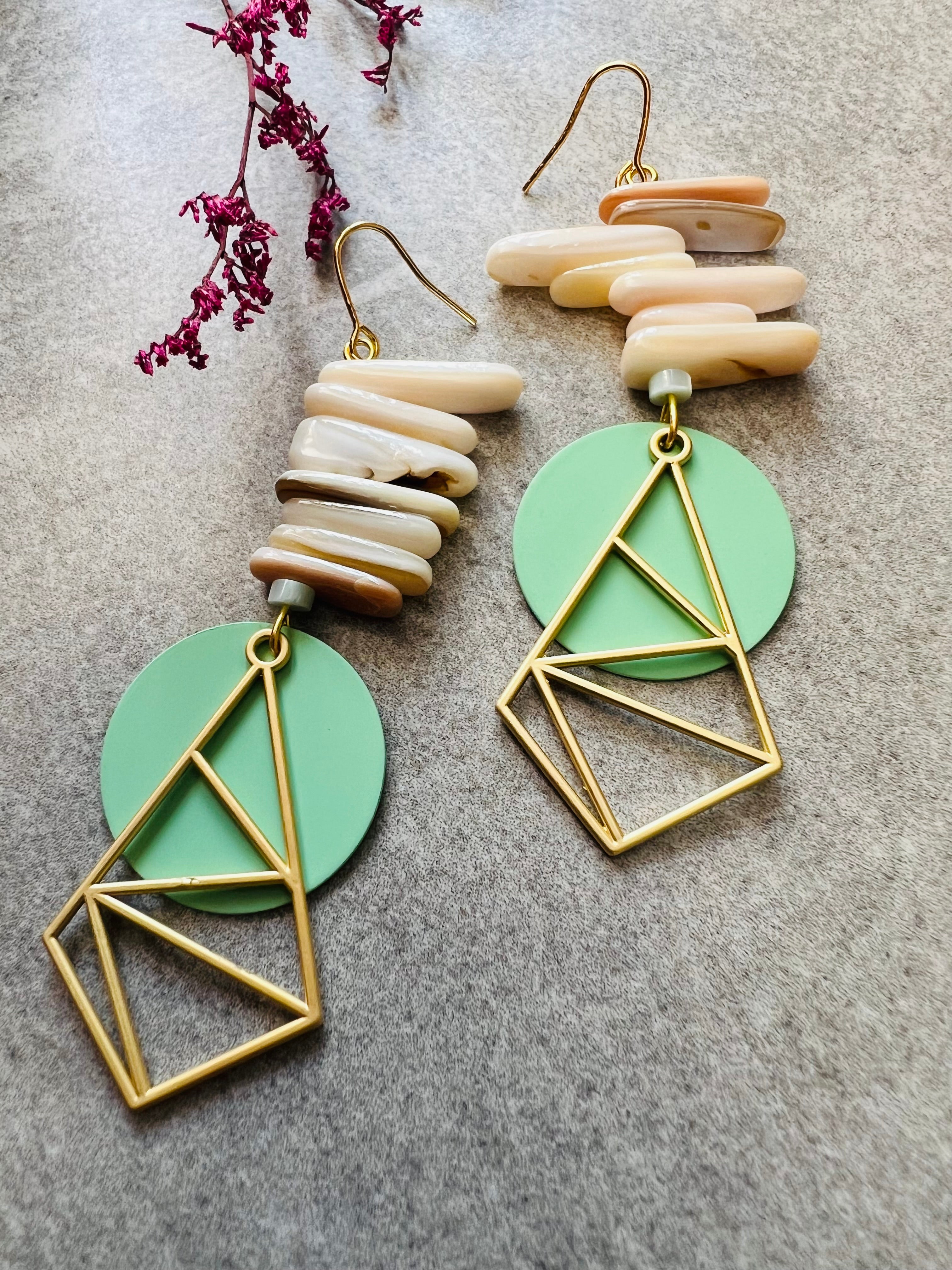 Boucles d’oreilles KENZA perles nacrées et pastille vert amande - Créations Uniques