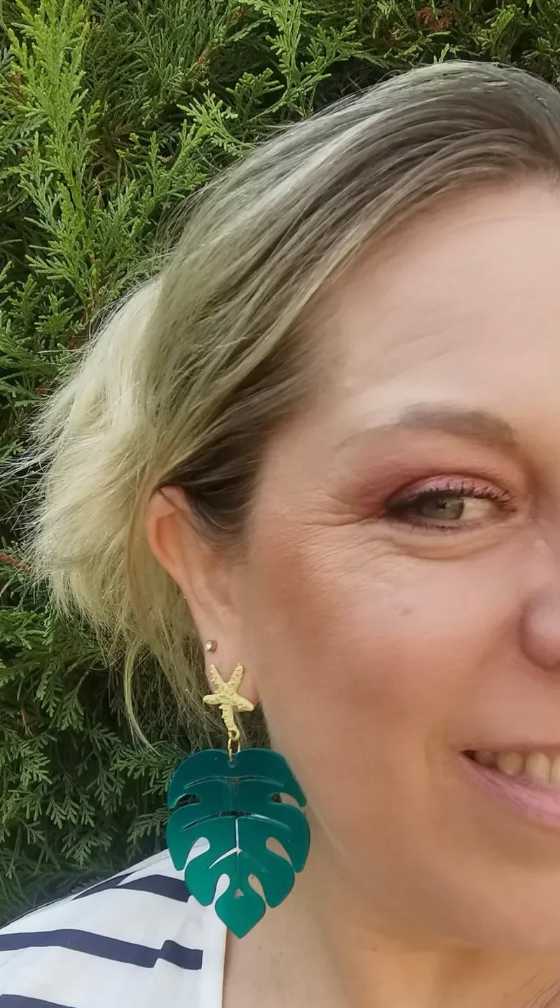 Boucles d’oreilles PRUDENCE feuilles tropicales turquoises et clous étoiles de mer - Créations Uniques