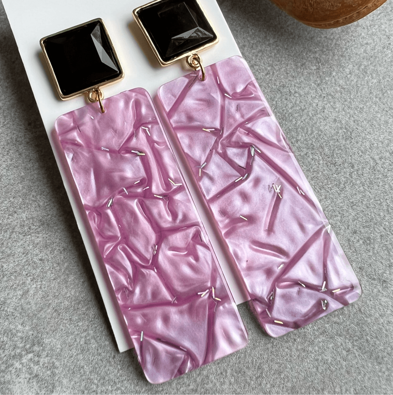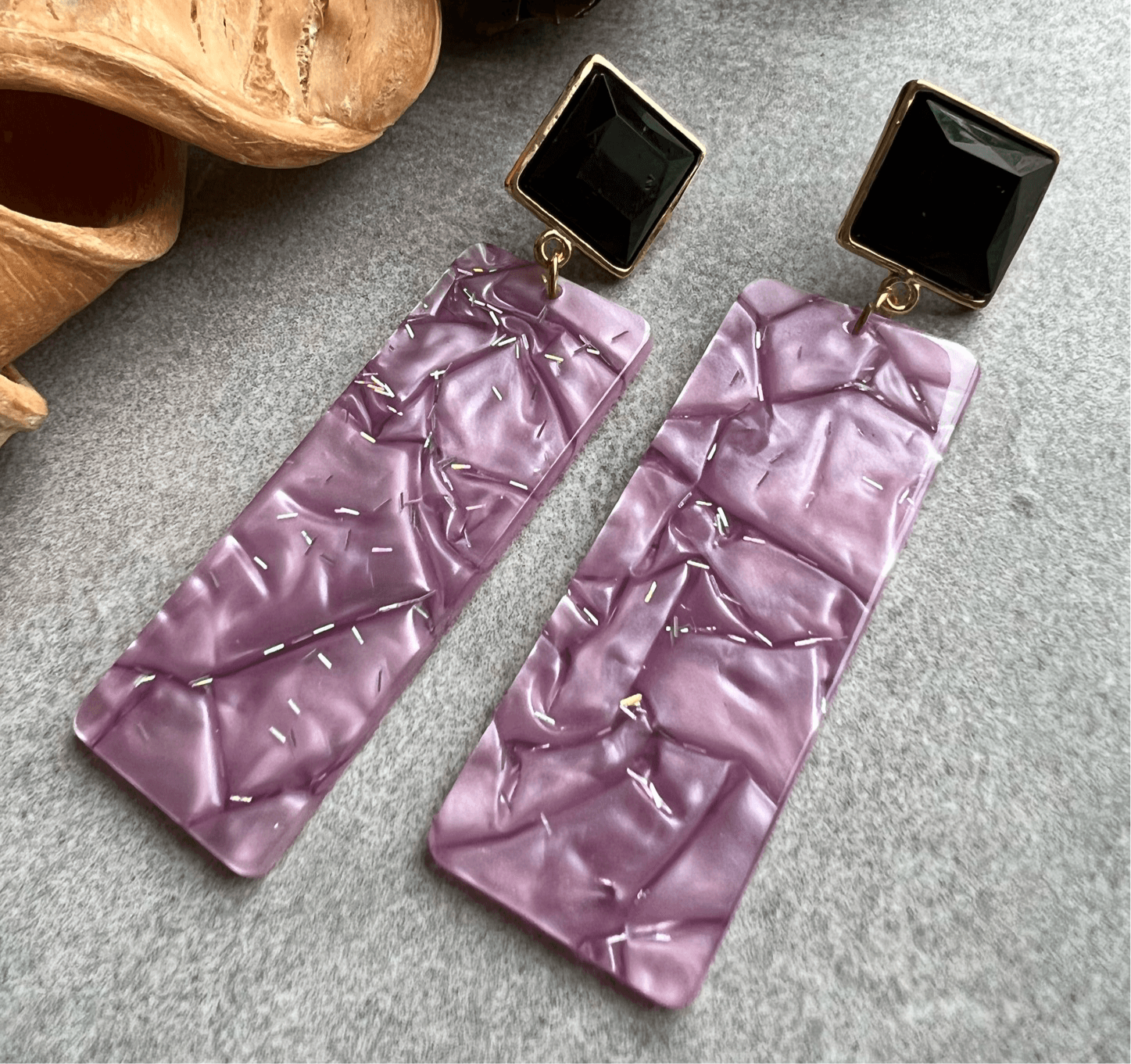 Boucles d’oreilles CATELYNE rectangles résine pailletée violet mauve