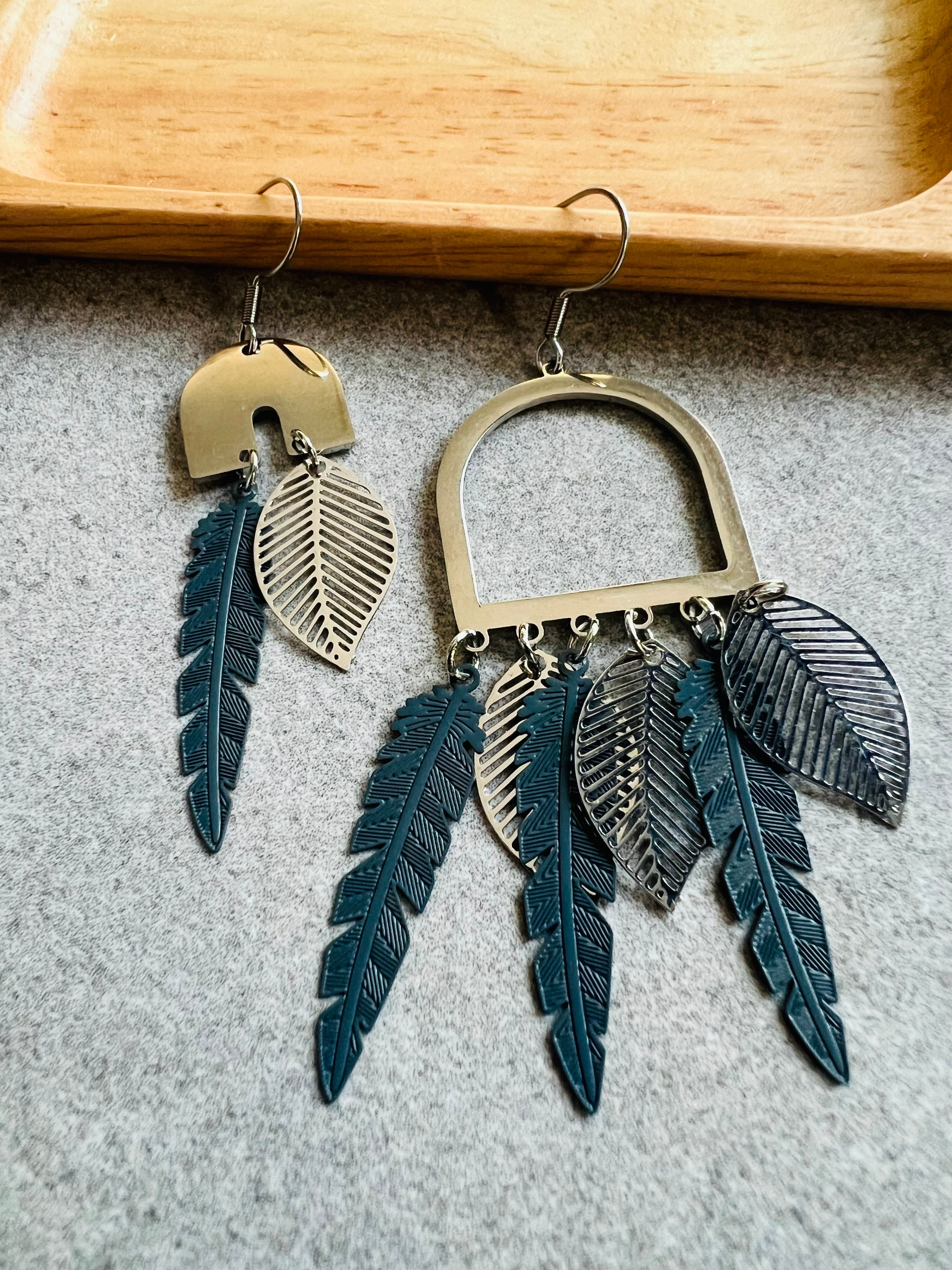 - Midnight blue feathers and silver leaves.