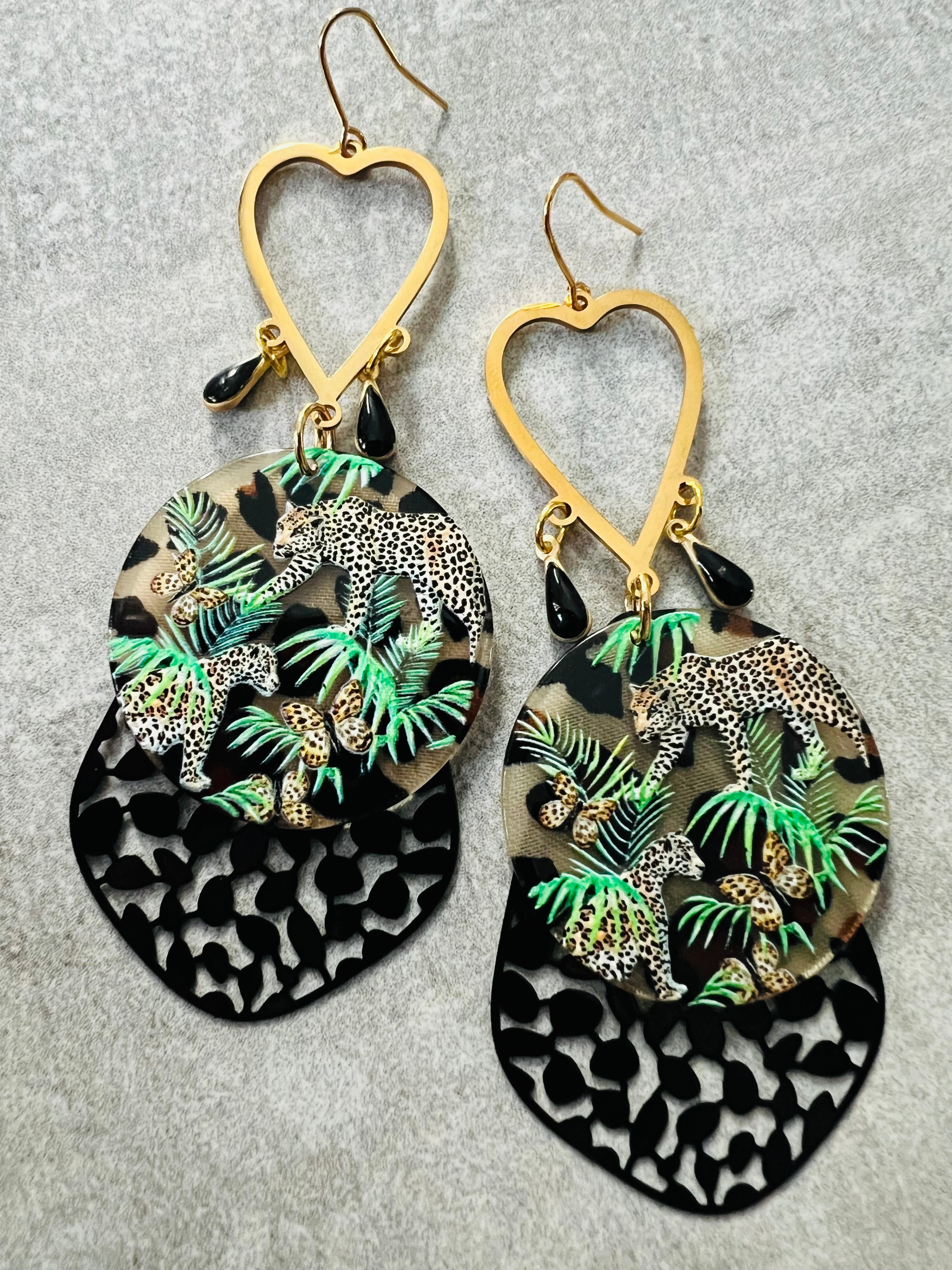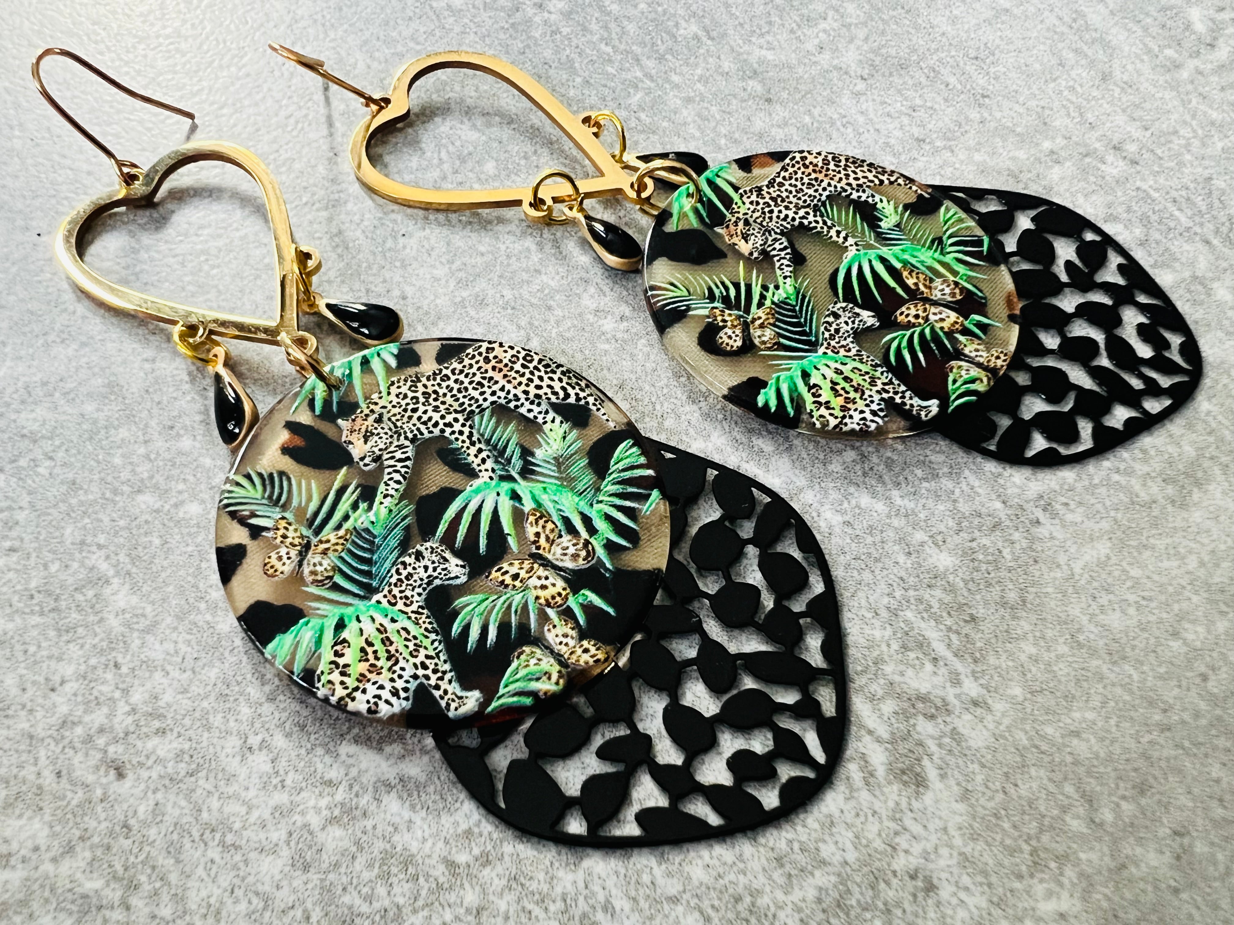 - Limited edition. - Mini black drops and resin with panther pattern and stainless steel hearts.